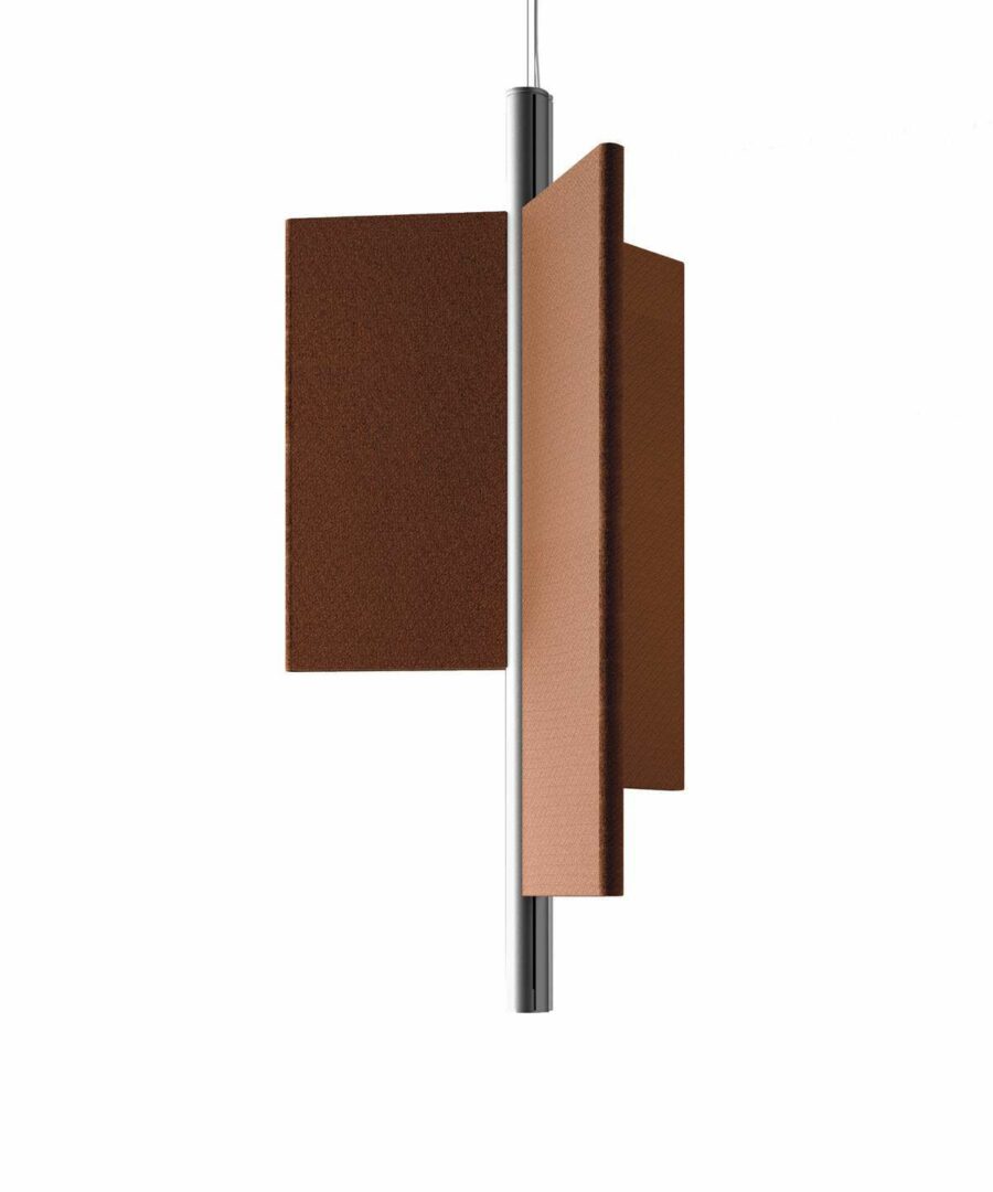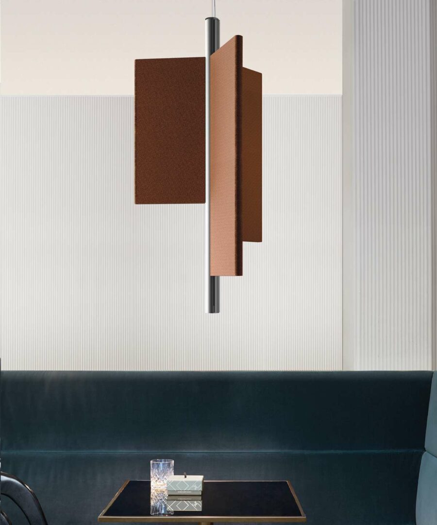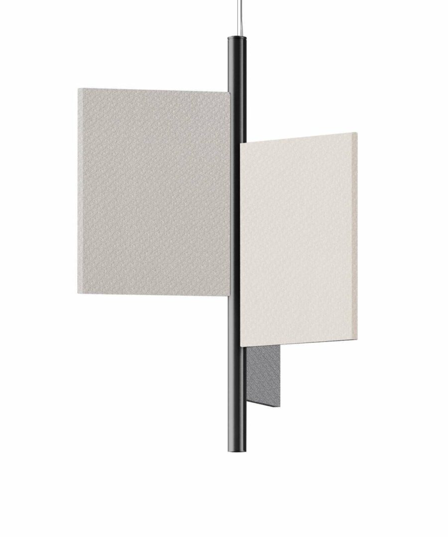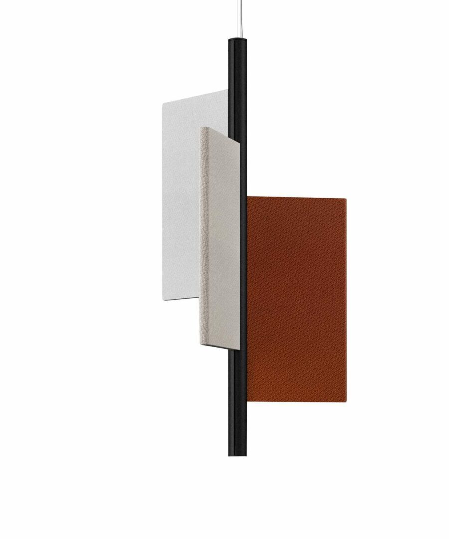 Особенность модели – три акустические панели из высокоэффективного звукоизоляционного материала, покрытые тканью на выбор. Доступны различные конфигурации: плоские, сдвинутые или комбинированные, что позволяет адаптировать светильник под интерьер.