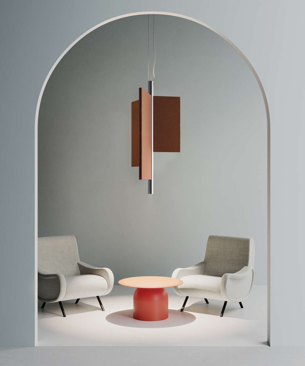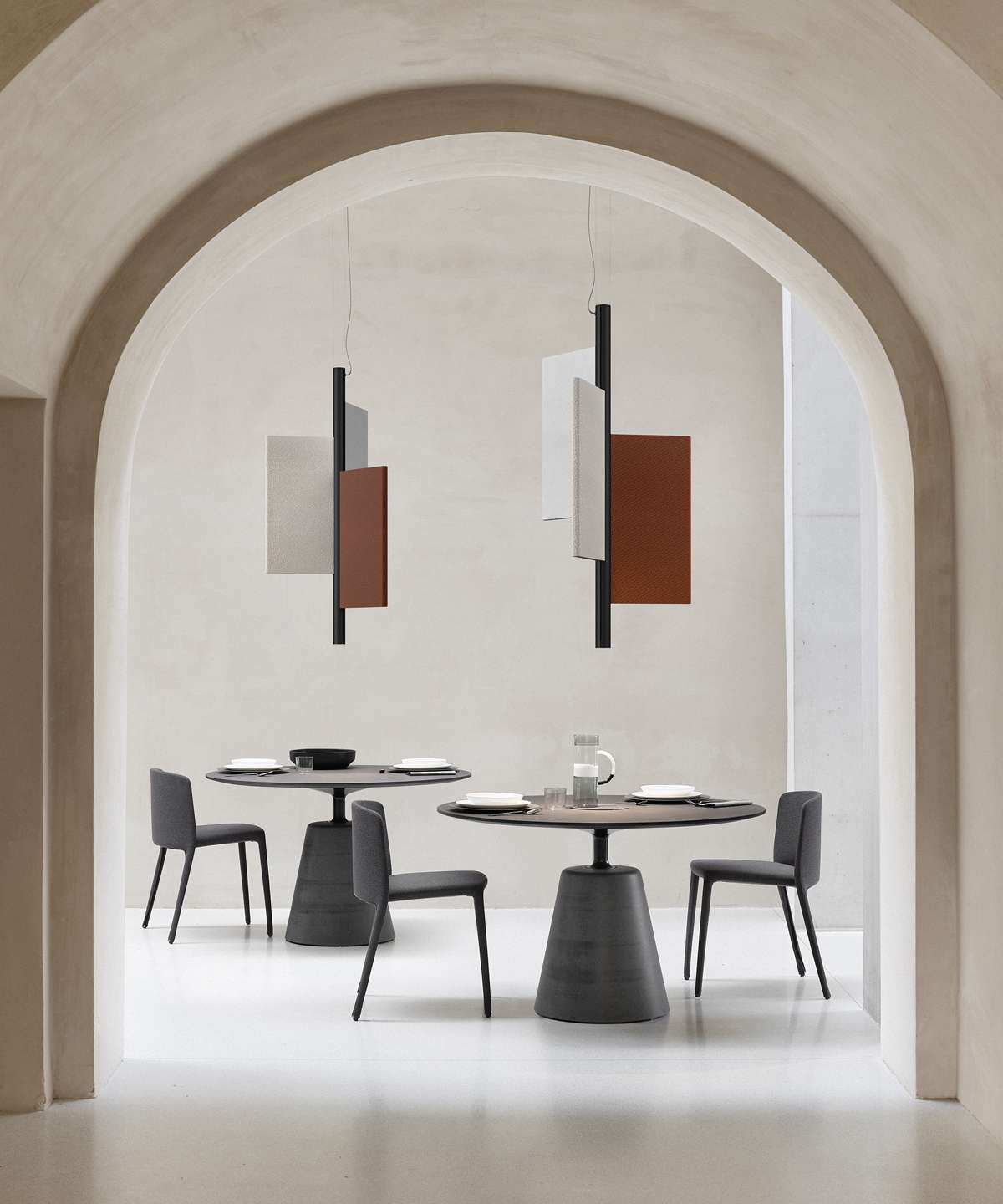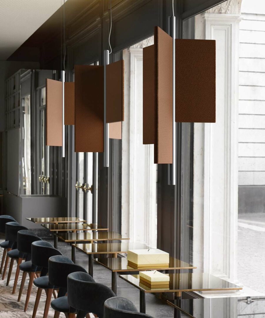 Особенность модели – три акустические панели из высокоэффективного звукоизоляционного материала, покрытые тканью на выбор. Доступны различные конфигурации: плоские, сдвинутые или комбинированные, что позволяет адаптировать светильник под интерьер.