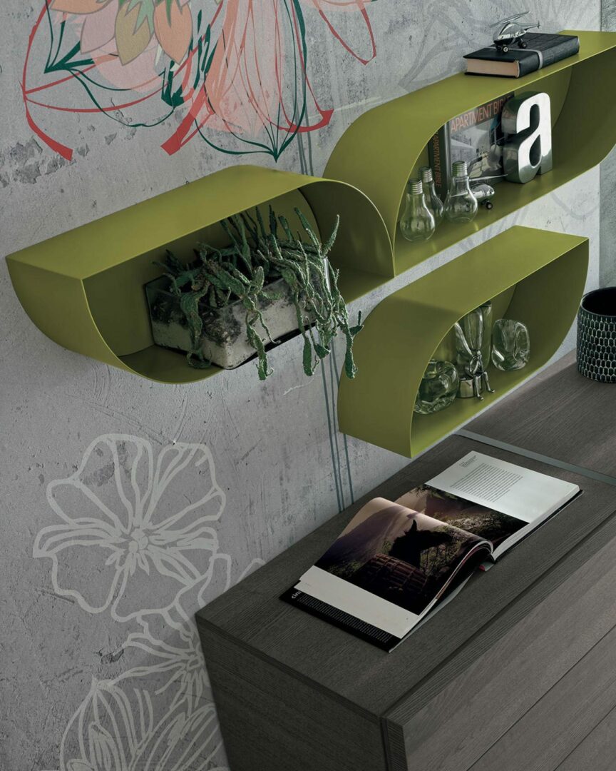 Каждая деталь полки Petalo продумана до мелочей. Элегантные навесные металлические секции в цвете «salvia 159» прекрасно гармонируют с любым интерьером, придавая ему лёгкость и воздушность. Размеры полки позволяют использовать её как в просторных гостиных, так и в уютных уголках, создавая стильные композиции.