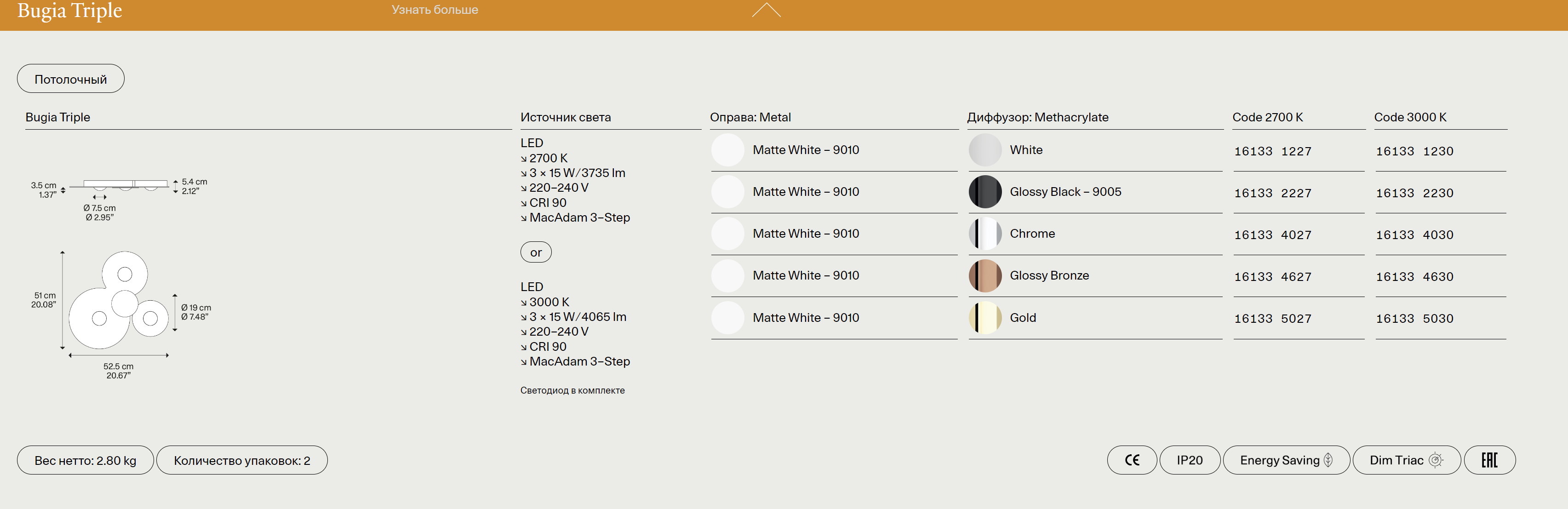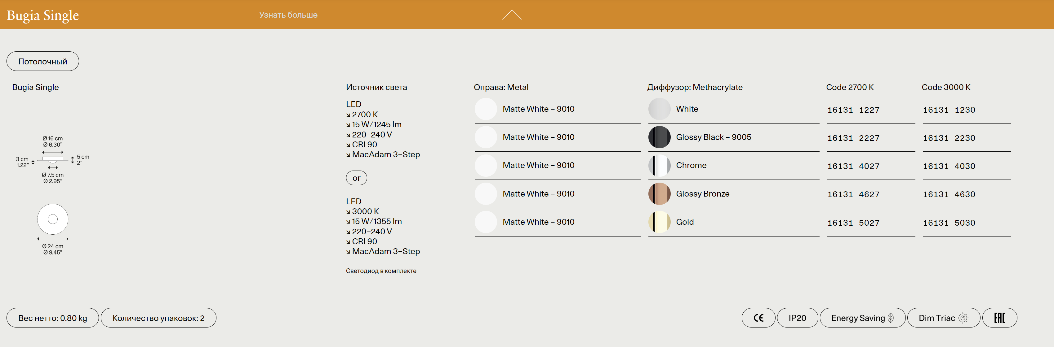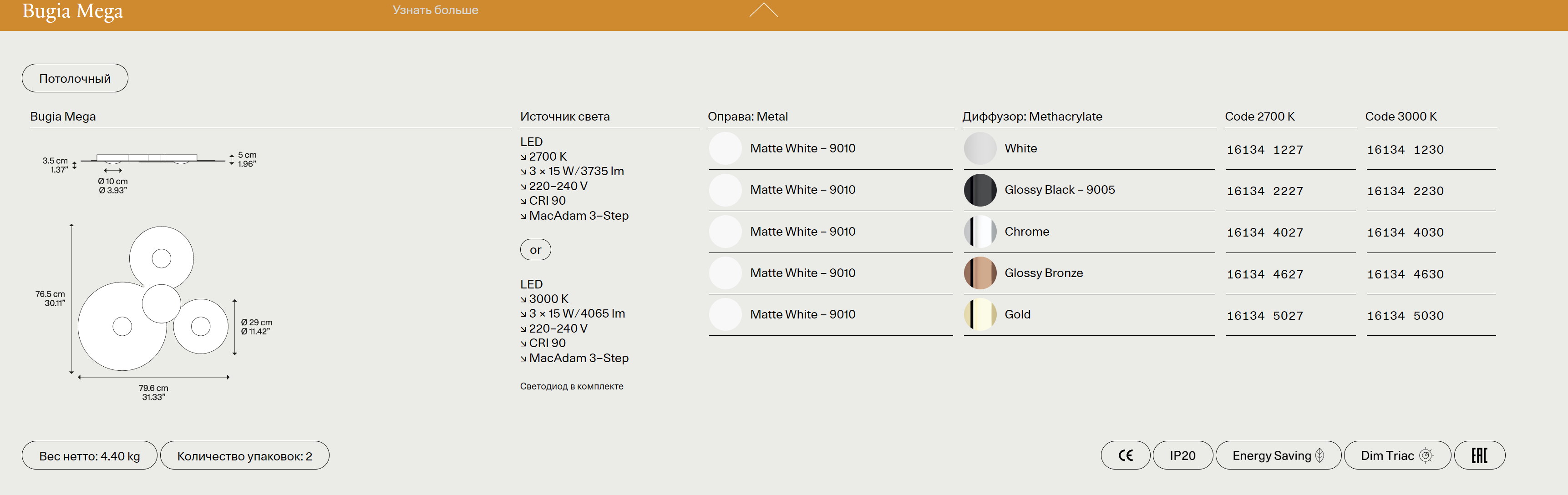 Потолочный светильник Bugia отличается лаконичным, но выразительным дизайном, в котором сочетаются современные тенденции и классическая утонченность. Его плавные линии и сдержанная геометрия создают ощущение легкости, а продуманная конструкция обеспечивает равномерное и мягкое освещение. Bugia идеально впишется как в роскошные гостиные и спальни, так и в минималистичные офисы или рестораны, подчеркивая статус и безупречный вкус владельца.