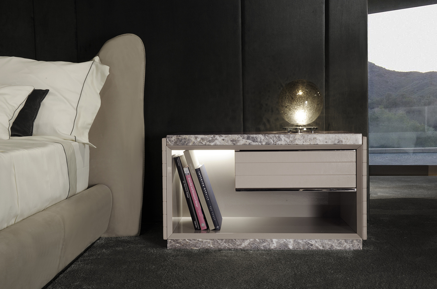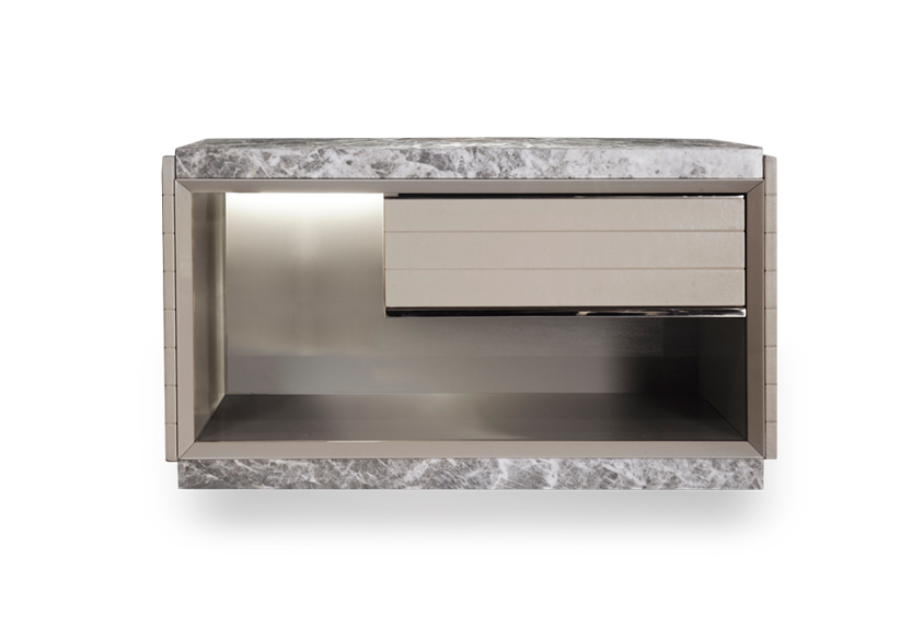 Тумбочка Morfeo изготовлена из благородных материалов, таких как мрамор, кожа, металл и лакировка. В дополнение, открытый отсек оснащён светодиодным освещением, что придаёт дополнительный шик и функциональность. Мраморная столешница не только выглядит великолепно, но и обеспечивает долговечность и устойчивость к повреждениям, что делает эту тумбочку идеальным выбором для жизни в современном доме.