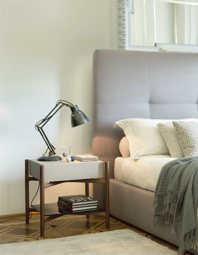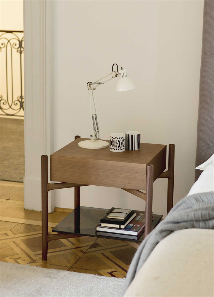 Прикроватный столик Regent 2 обладает уникальной структурой из массива ореха каналетта, что придает ему особую прочность и долговечность. Ящик, предлагаемый в варианте из дерева или обтянутый кожей, обеспечивает мягкое закрывание, добавляя нотку уюта и комфорта. Нижняя деревянная полка не только увеличивает функциональность, но и добавляет эстетическую ценность, позволяя разместить на ней книги, аксессуары или светильник.