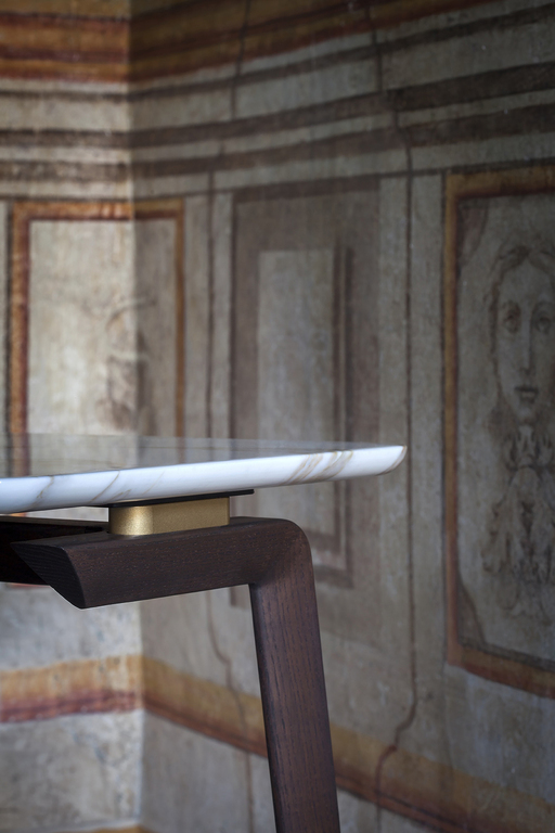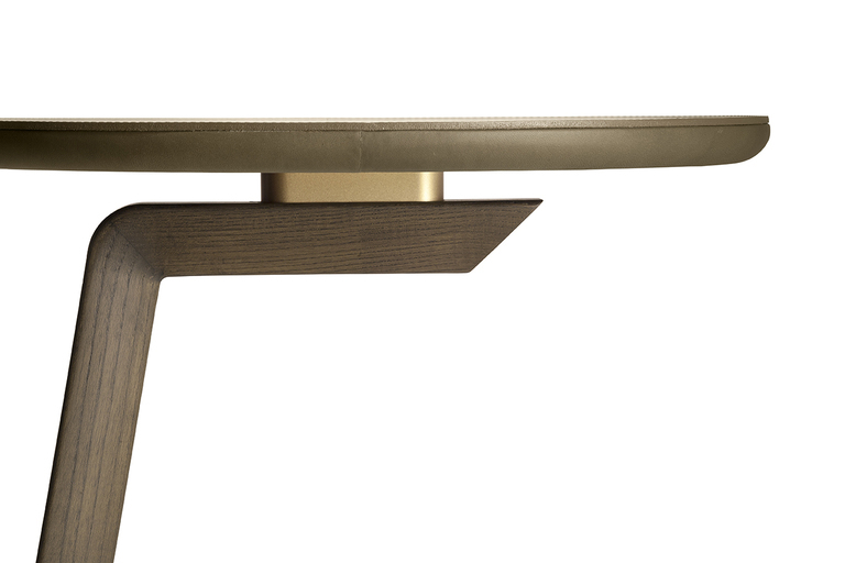 Столешница, обитая кожей Cuoio Saddle Extra или Pelle Frau®, предлагает тактильное наслаждение, а варианты мрамора Emperador и Calacatta добавляют роскоши. Металлические детали выполнены из матовой стали и натуральной латуни, что обеспечивает долговечность и стиль.
