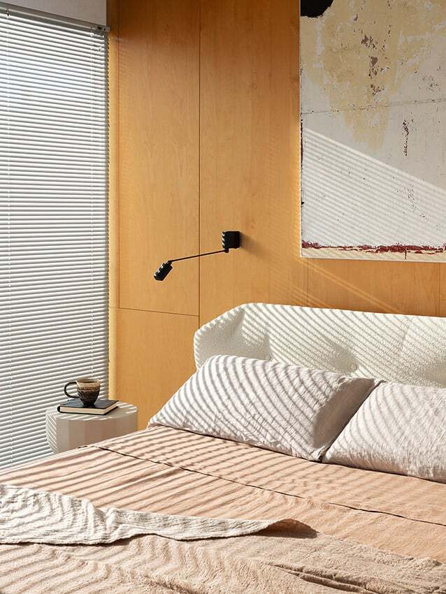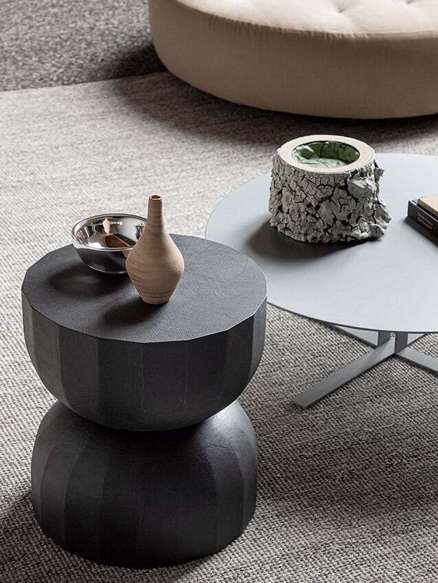 Столик выполнен из натуральных материалов с теплой текстурой, напоминающей патину средиземноморских церквей. Двухъярусная сферическая конструкция придает ему утонченность и визуальную легкость, а фрагментированная поверхность отсылает к традиционным архитектурным элементам.