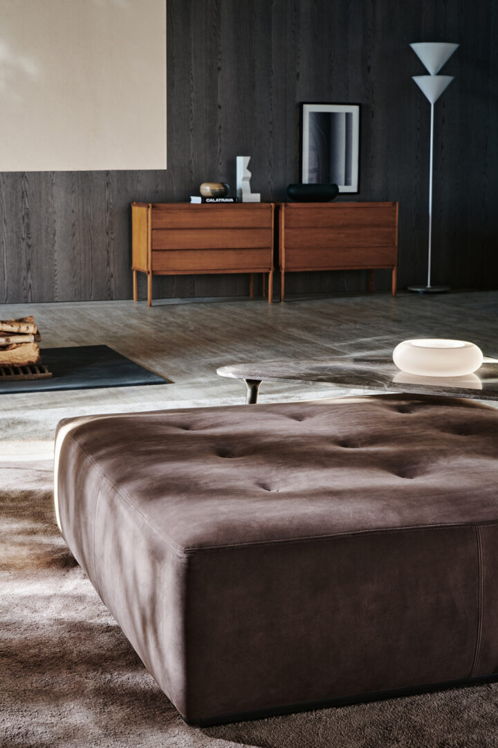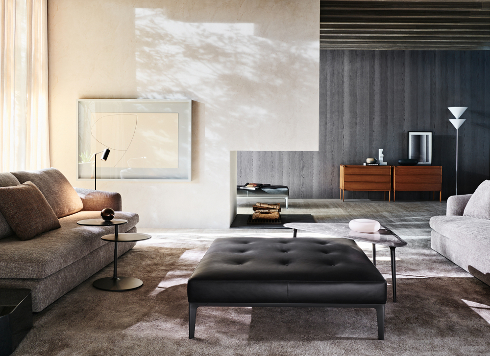 Пуф EUSTON от итальянской фабрики MOLTENI & C сочетает строгую геометрию форм с элегантной детализацией. В коллекции представлены две версии: приподнятая модель на металлическом основании и напольный вариант с почти незаметным каркасом.