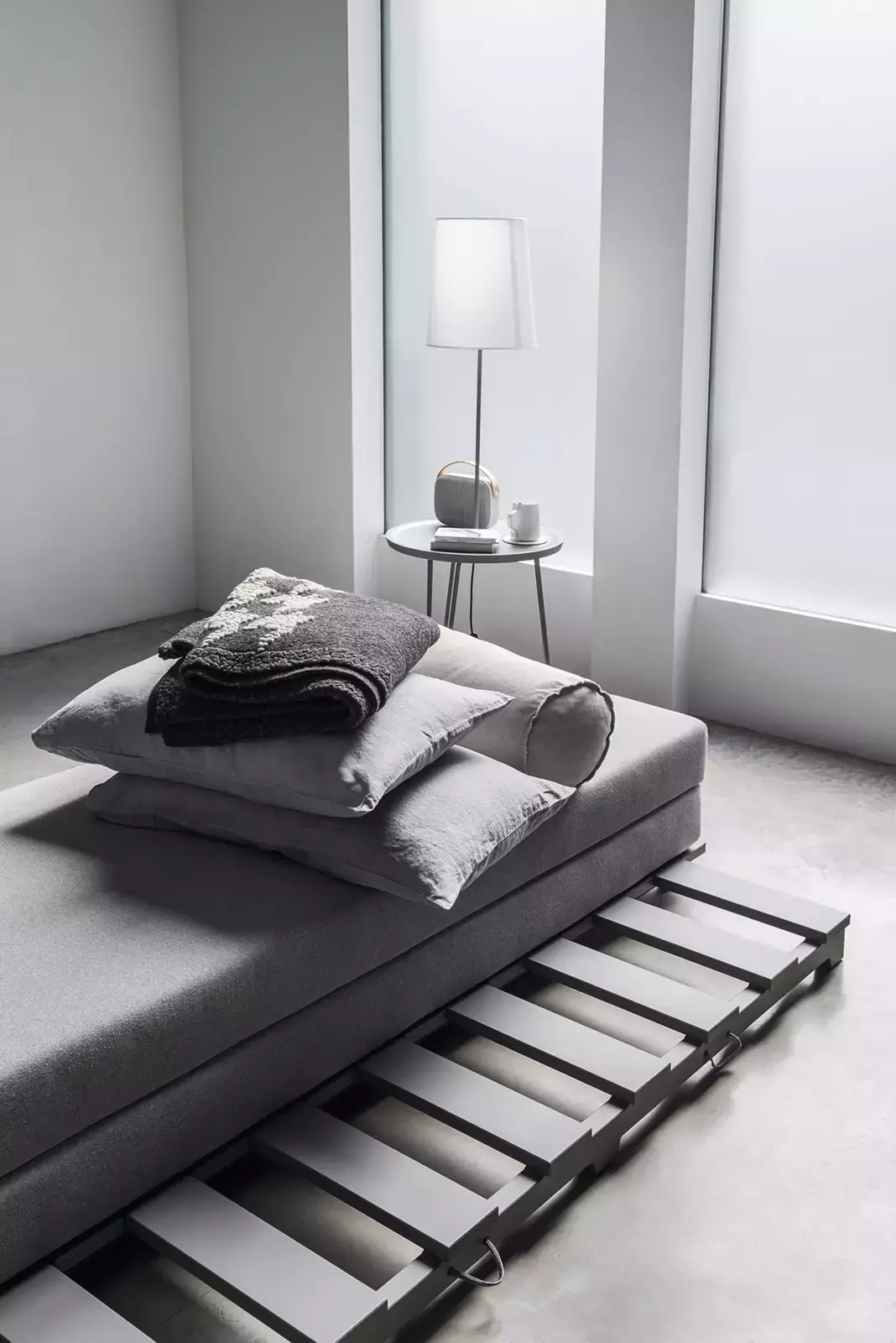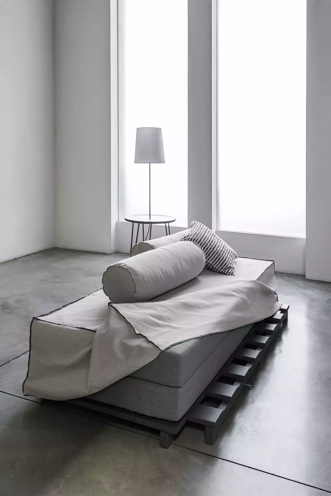 Пуф-кровать Kubo от Gervasoni Collection Beds – итальянский дизайн с функциональной трансформацией. Модель сочетает в себе стильный пуф, диван и полноценную кровать благодаря складному матрасу и выдвижному решетчатому основанию. Идеальное решение для компактных пространств: гостиной, кабинета или спальни.