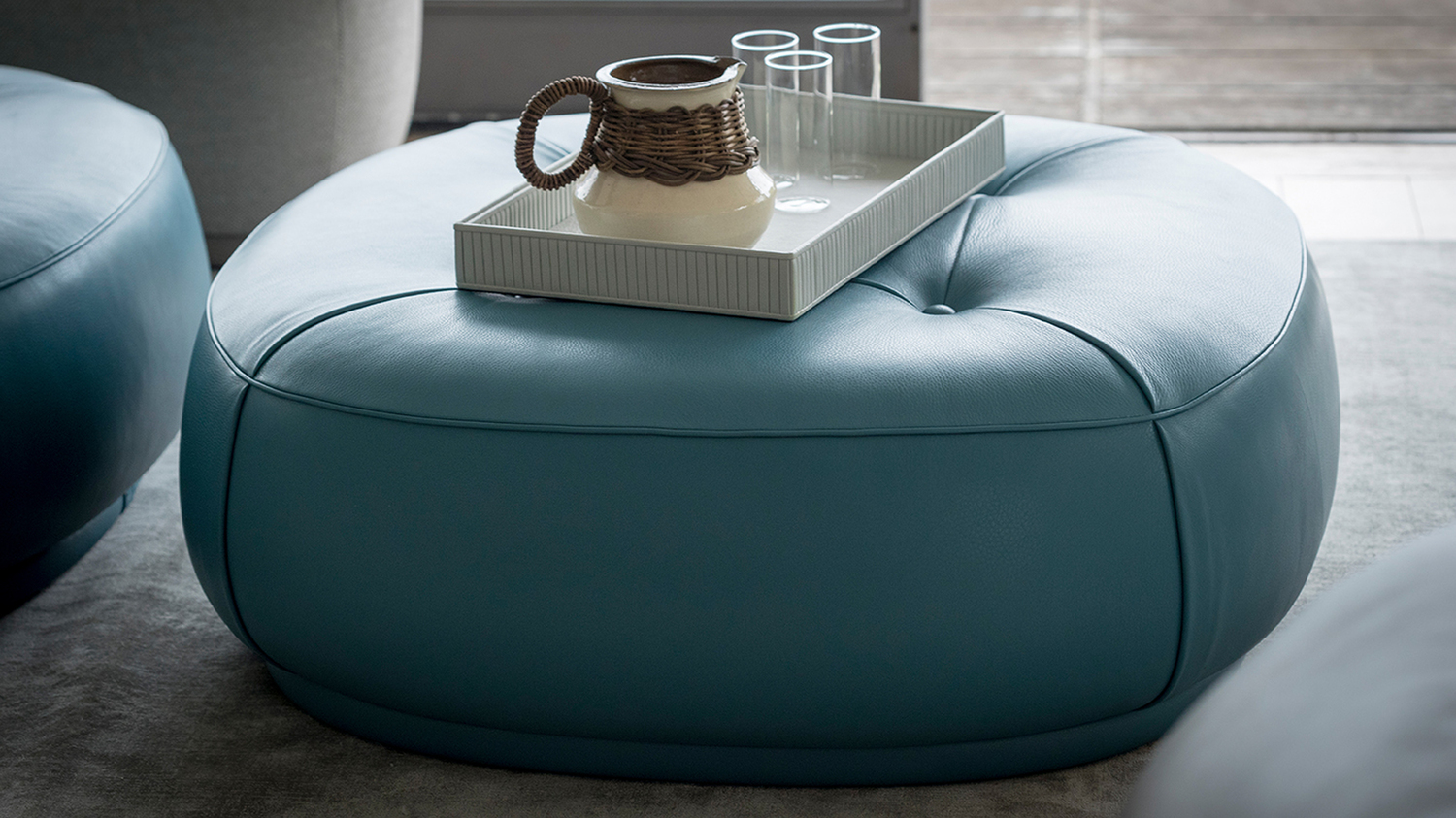 Пуф Leplì обладает уникальным дизайном, который прекрасно сочетает в себе элегантные линии и мягкие формы. Его размер 106×106 см позволяет использовать его как уютный пуф, банкетку или даже небольшой столик. Особое внимание привлекает декоративный кожаный ремешок, который подчеркивает изысканность изделия. Когда обивка пуфа выполнена из кожи Pelle Frau®, декоративная полоса всегда будет гармонировать с основным цветом, создавая единый образ. Четыре аккуратные складки, начинающиеся от центральной кнопки, придают пуфу Leplì характерный силуэт, делая его настоящим акцентом в вашем интерьере.