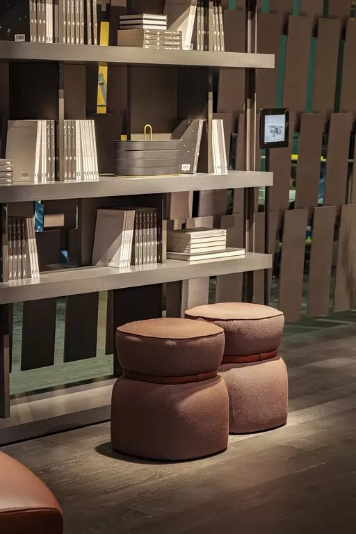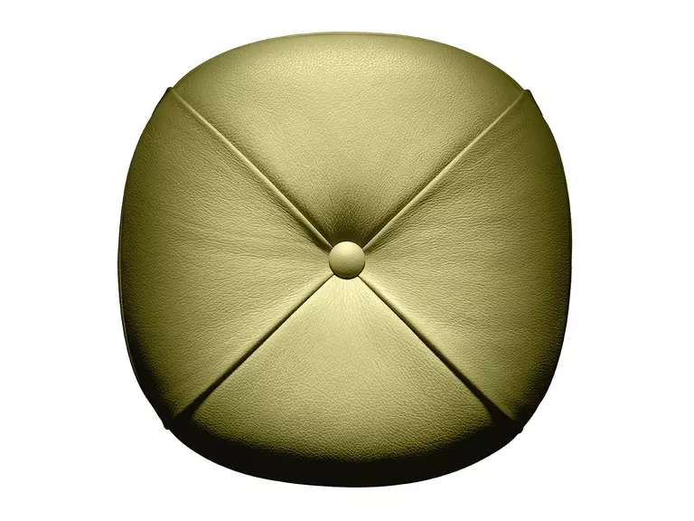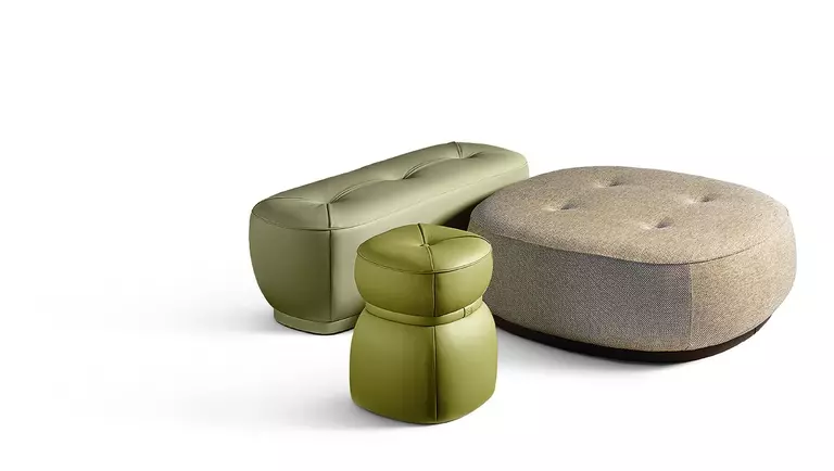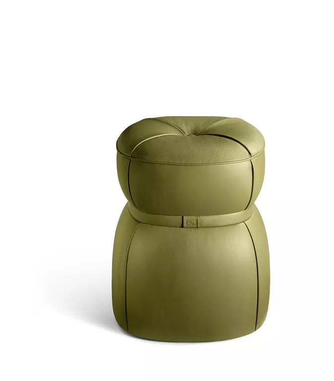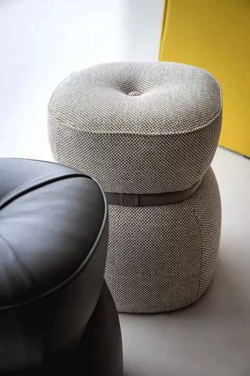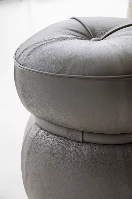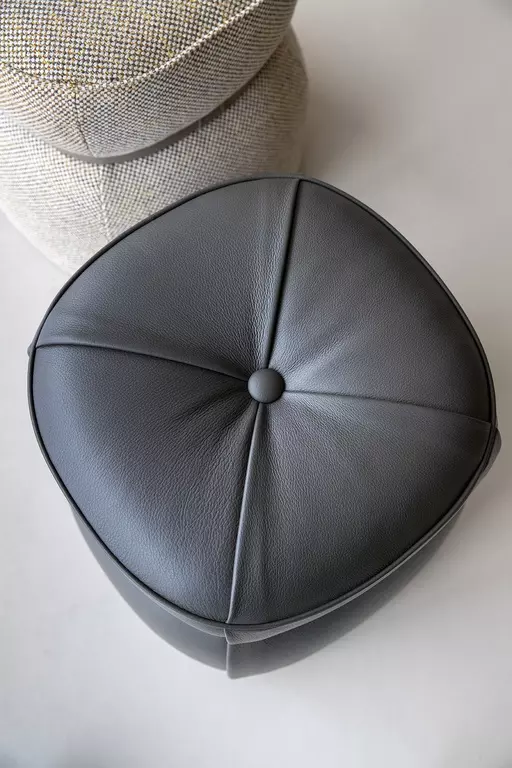 Puф Leplì предлагает возможность выбора обивки из премиальной кожи Pelle Frau® или из изысканной ткани, дополняемой декоративным кожаным ремешком. Для кожаного варианта предусмотрены четыре складки, которые придают пуфу уникальный профиль, а в тканевом – стильная строчка.