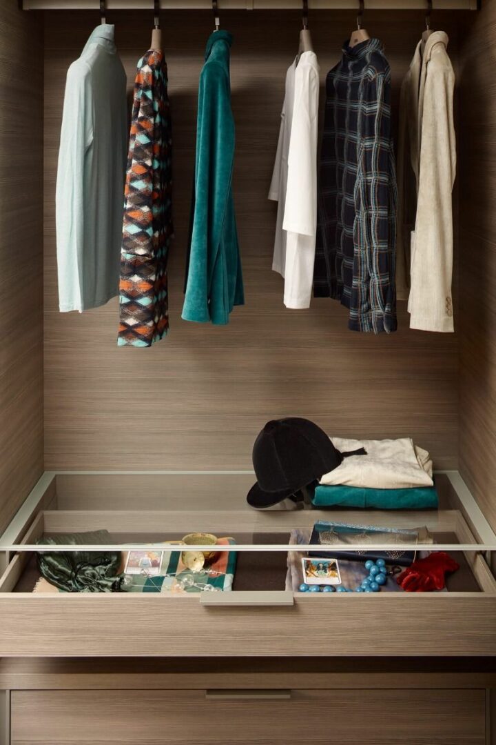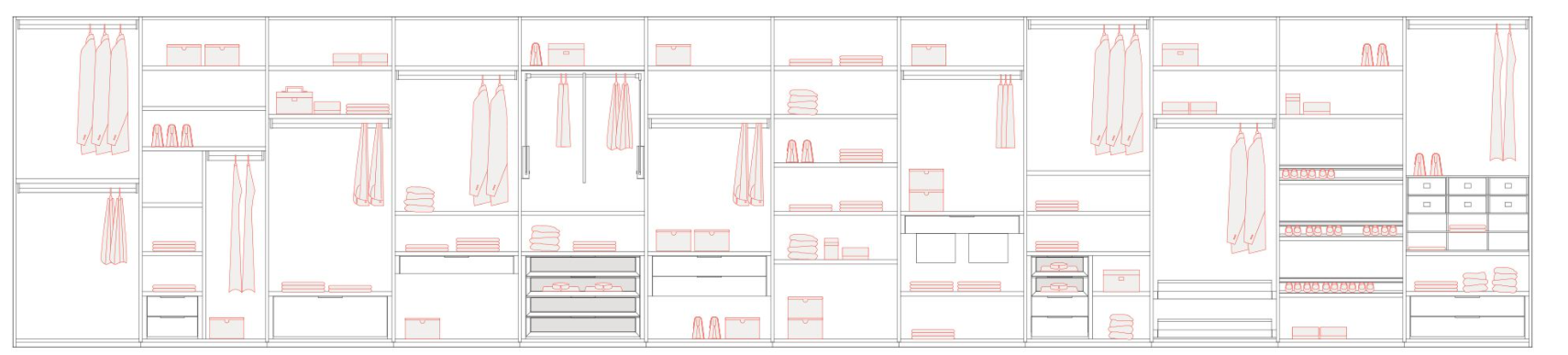 Программа Armadio al Centimetro предлагает широкий выбор отделок и продуманных решений для интерьера: ящики, стеллажи для брюк, ремней и обуви, полки, вешалки с интегрированной подсветкой. Дополнительные элементы из кожи и ткани, такие как вставки для ящиков и коробки для рубашек, подчеркивают премиальное качество и внимание к деталям.