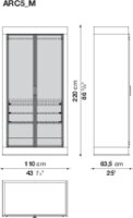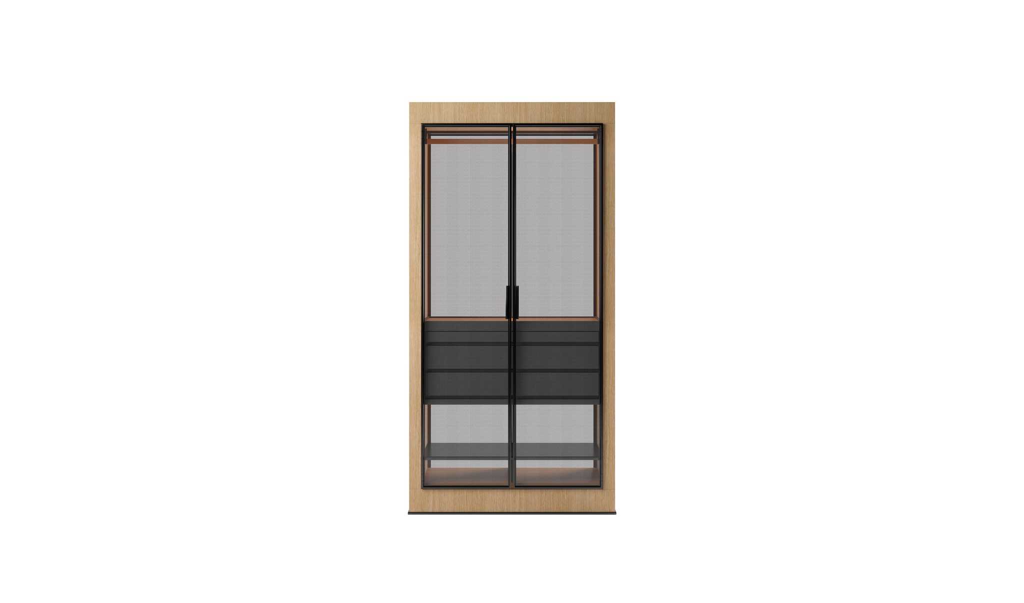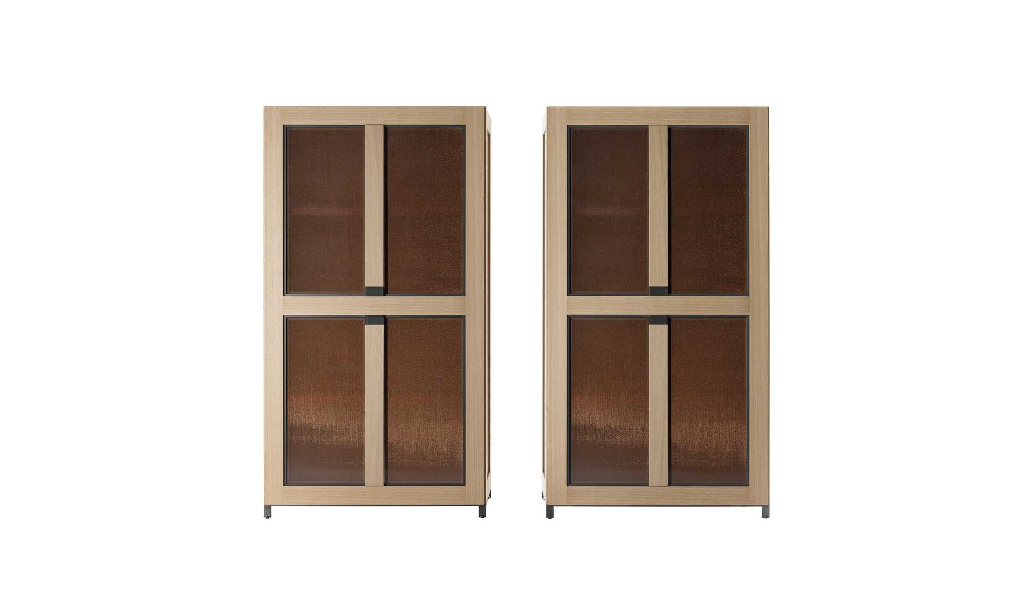 Шкаф оборудован раздвижными дверями, которые обеспечивают легкий доступ к содержимому, не занимая при этом лишнего пространства. Размеры шкафа: L 117.2 | H 239–255 см и L 136.2 | H 239–255 см, что позволяет выбрать оптимальный вариант для вашего интерьера. Доступные отделки включают лакированные поверхности с открытыми порами и глянцевые матовые цвета, а также термоварные дубовые акценты, которые добавляют нотку элегантности.