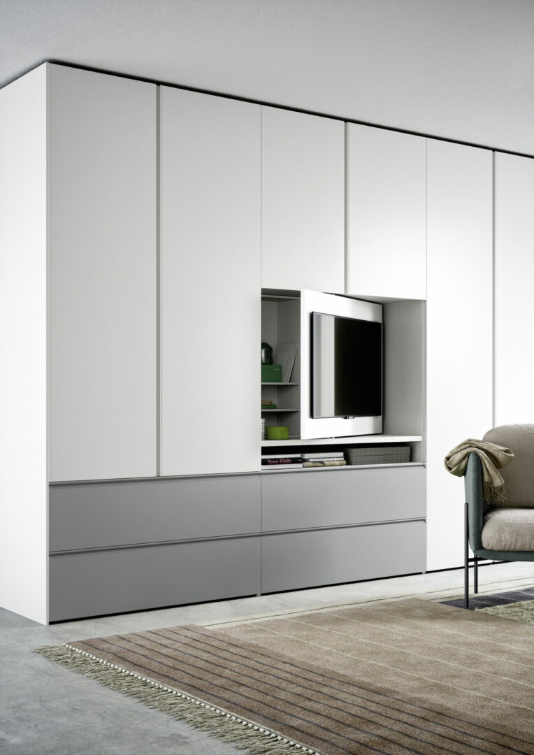Шкаф GOLA WITH TV от итальянской фабрики NOVAMOBILI – элегантное и функциональное решение для современного интерьера. Модель оснащена распашной дверью, поворотной панелью для монтажа телевизора и внешними выдвижными ящиками, что обеспечивает удобство хранения и эргономику пространства.
