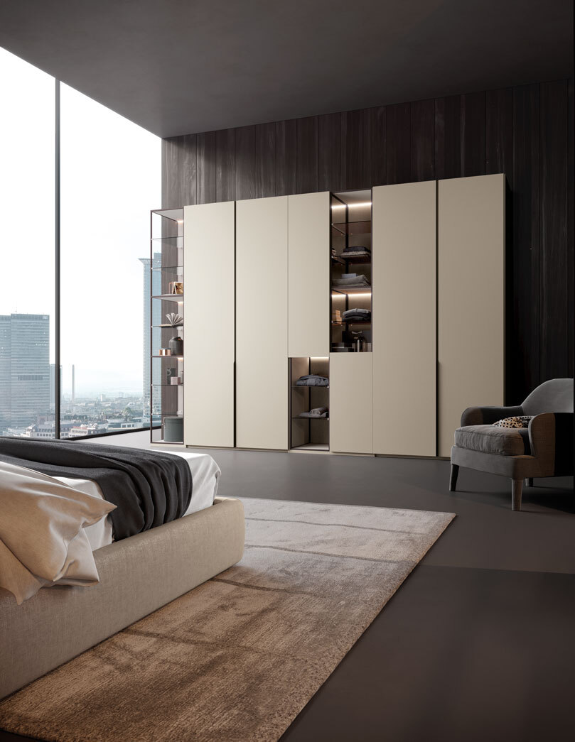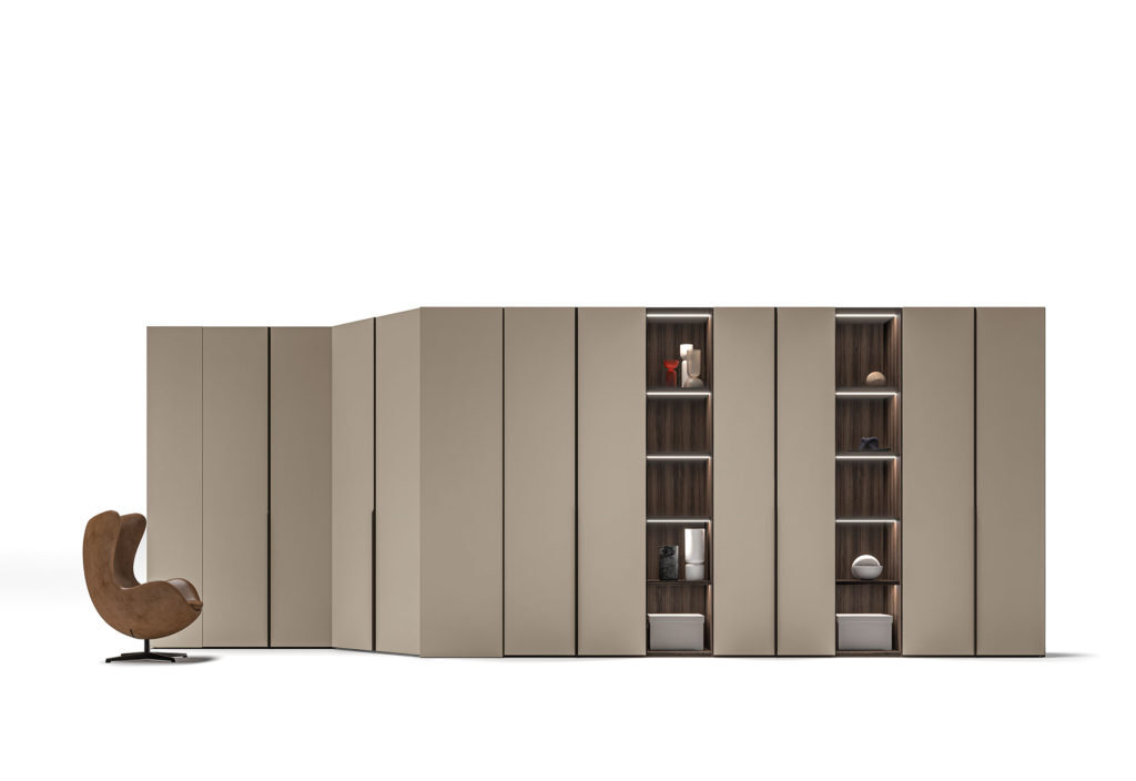 Модель с распашными дверями отличается строгим дизайном и продуманными деталями, такими как вертикальные металлические ручки, интегрированные в профиль. Итальянское качество материалов и сборки гарантирует долговечность и безупречный внешний вид.