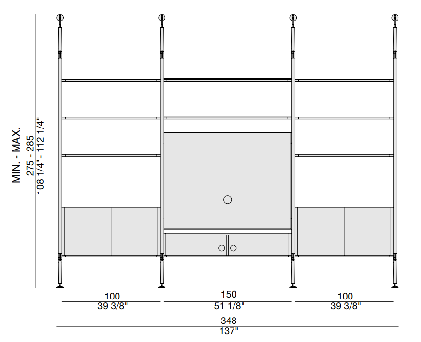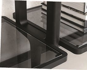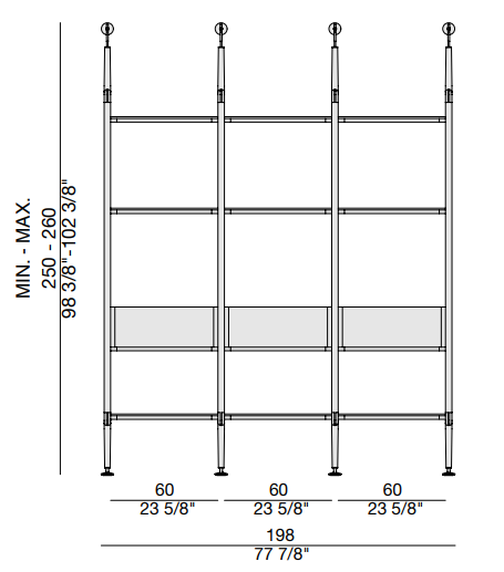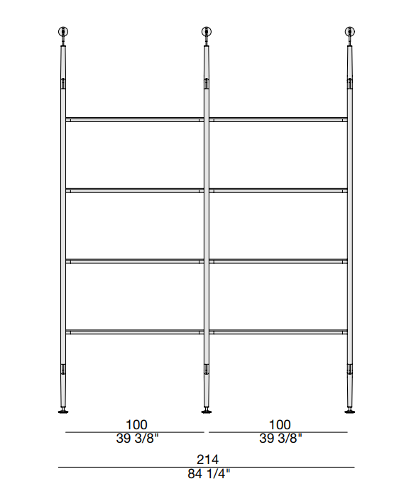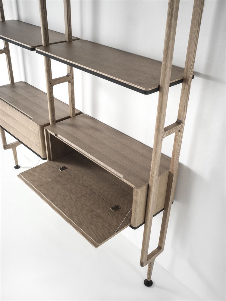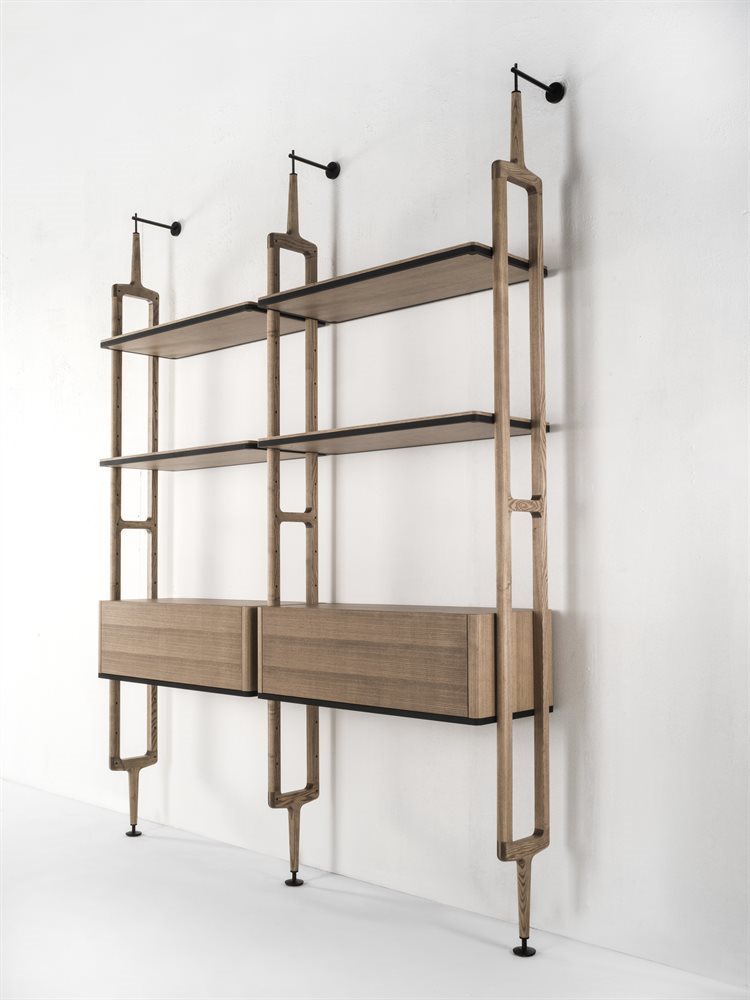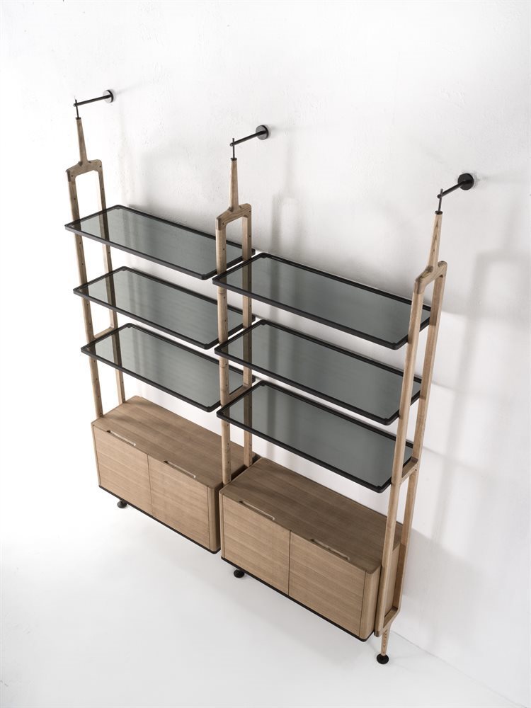 Этот модульный книжный шкаф предлагает уникальную комбинацию опорных колонн из ясеня и возможность крепления к потолку или стене. Вы можете настроить композицию с помощью полок из ясеня или дымчатого стекла, а также комодов и контейнеров, которые поддерживаются стильной матовой черной металлической рамой.