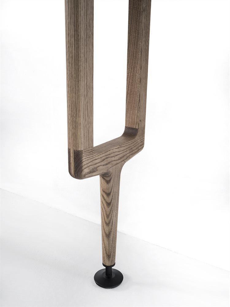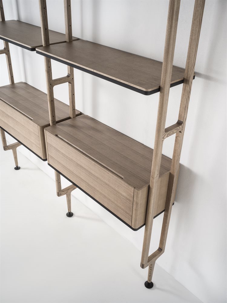 Стеллаж Aria воплощает в себе уникальное сочетание элегантности и современности. Опорные колонны из ясеня придают конструкции прочность и надежность, а возможность крепления к потолку или стене обеспечивает дополнительную устойчивость. Вы можете настроить композицию, добавляя полки из ясеня или дымчатого стекла, а также комоды и контейнеры, которые гармонично поддерживаются черной матовой металлической рамой. Этот элемент позволит вам организовать пространство, придавая ему утонченный вид.