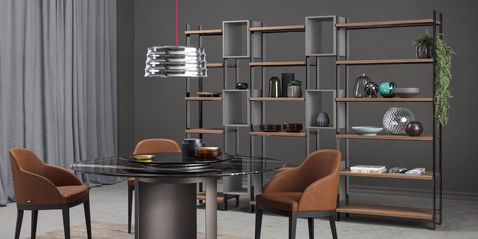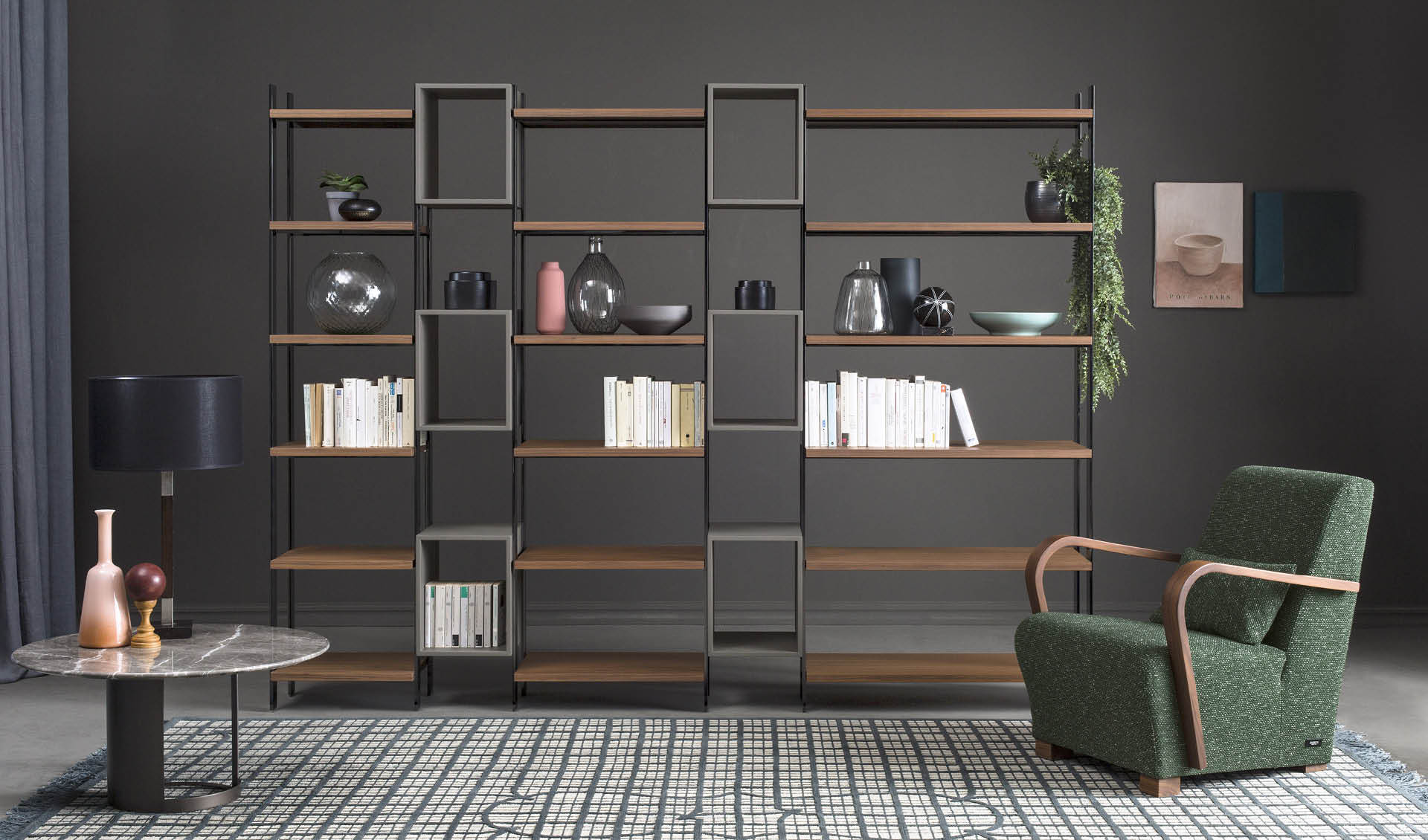 Вы можете комбинировать различные размеры полок (47, 62 и 92 см) и выбирать между отделкой из шпона ореха или матовым тиснением RAL. Стеллаж прекрасно впишется в современные интерьеры, создавая гармоничное пространство для книг и декоративных предметов.