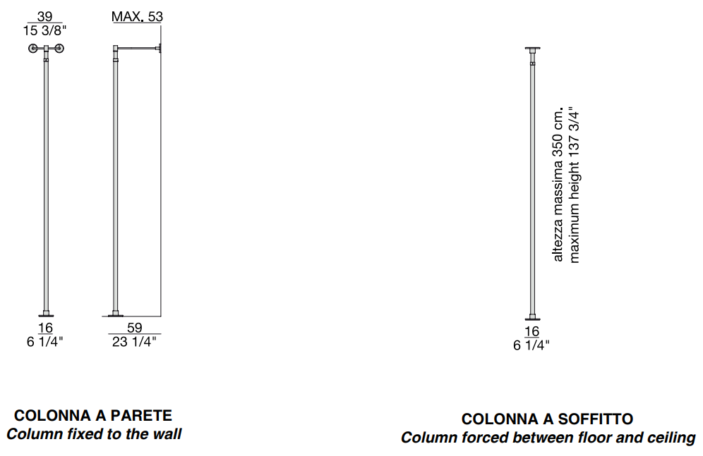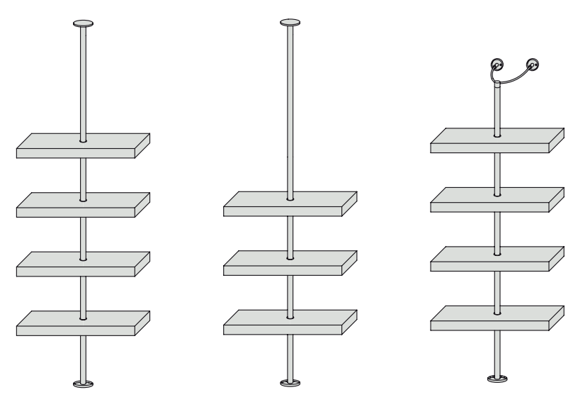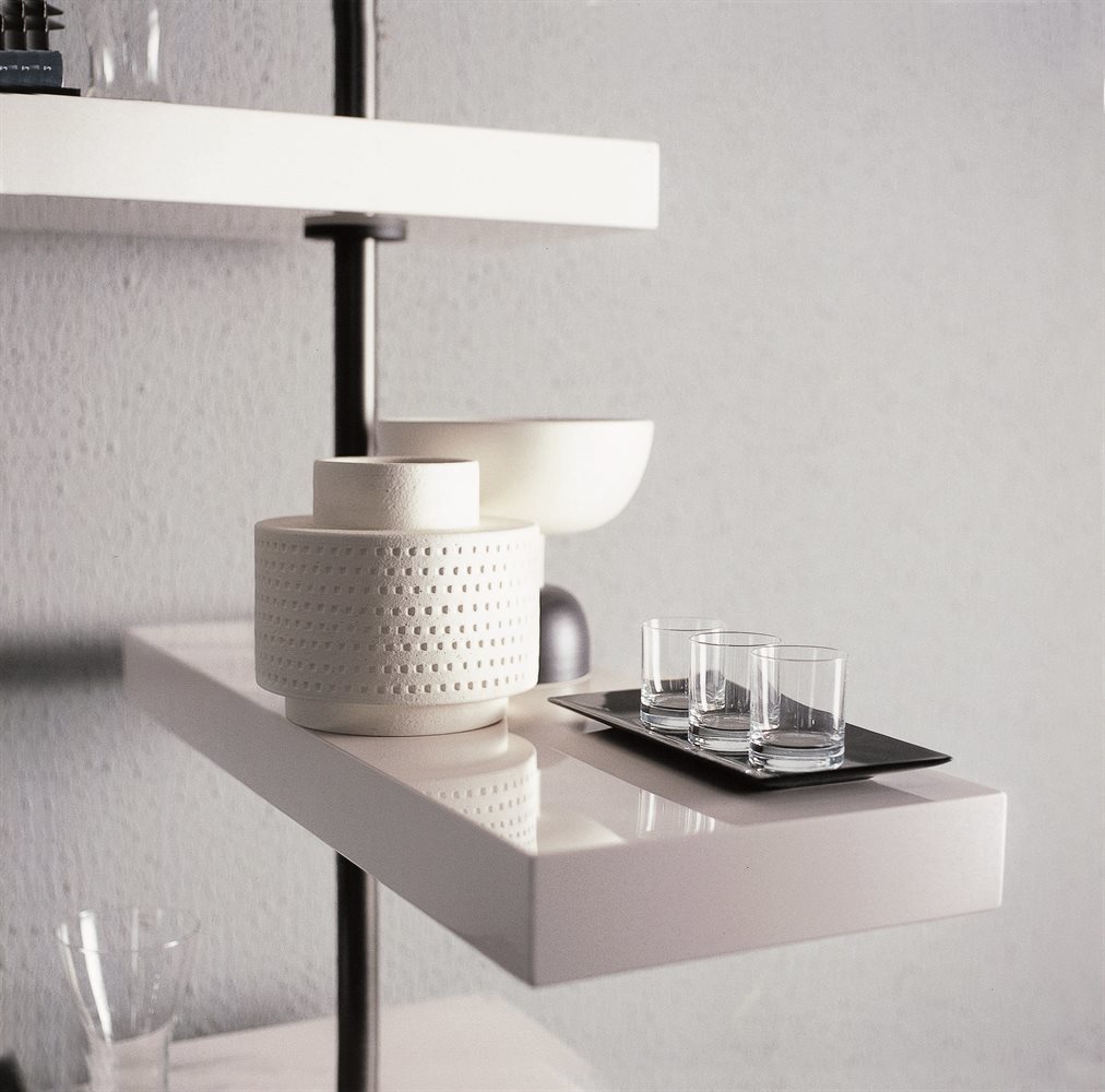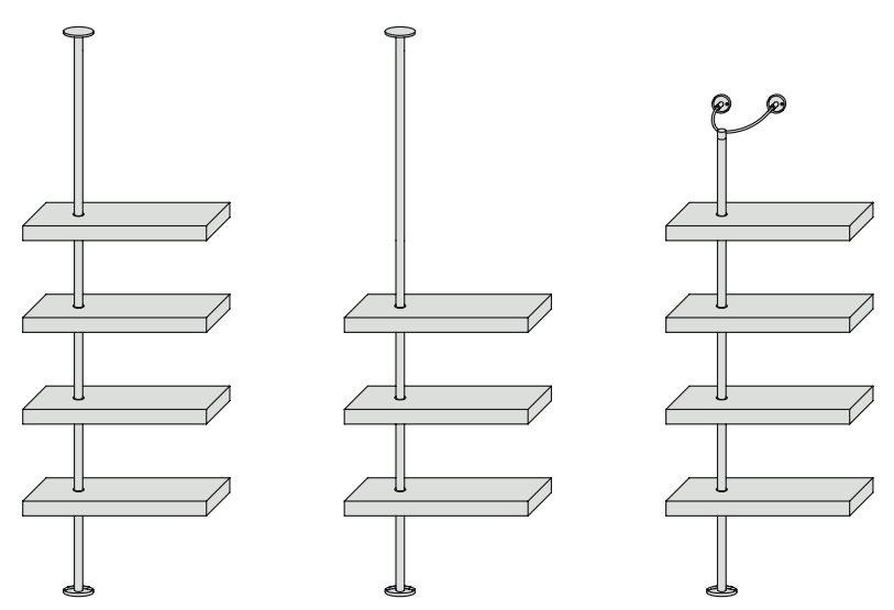 Элегантная металлическая колонна крепится к стене или потолку, поддерживая массивные дубовые полки. Возможность центрированного или децентрализованного крепления позволяет адаптировать стеллаж под любые требования пространства.