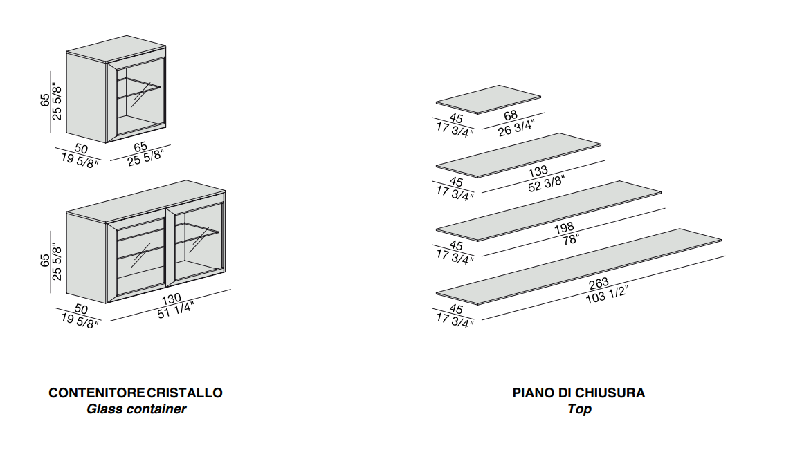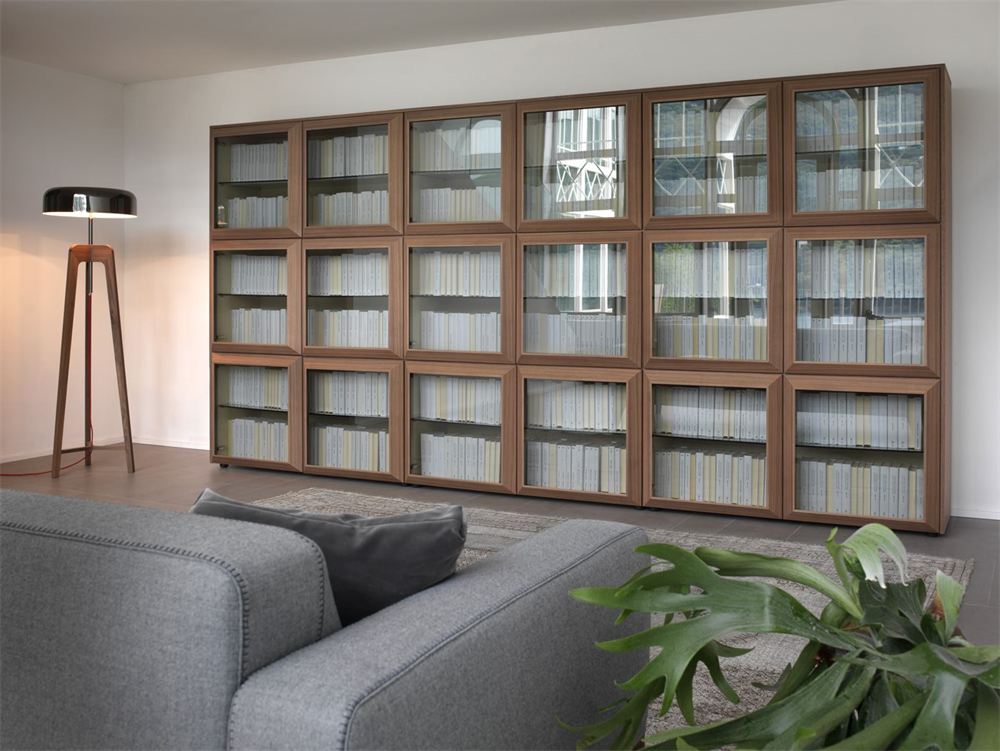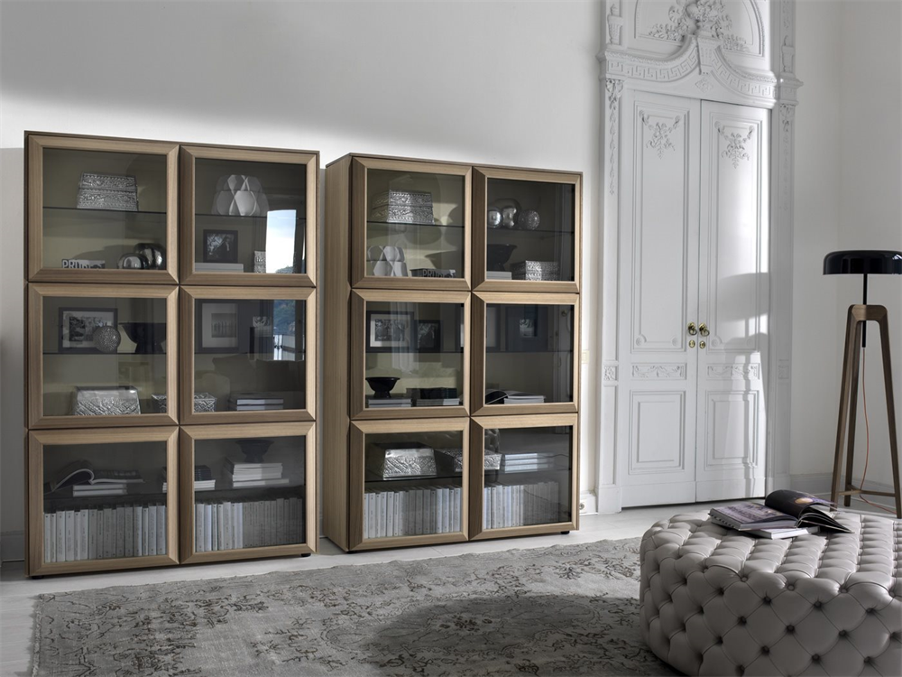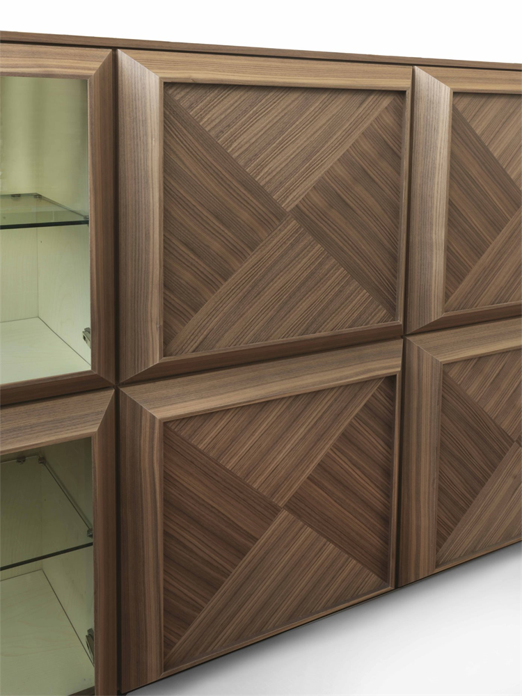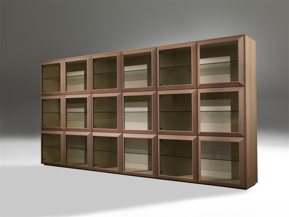 Элегантная модульная система, выполненная из ореха каналетта, предлагает как односторонние, так и двусторонние элементы, оснащенные стеклянными или деревянными дверями. Угловые элементы с стеклянной дверью добавляют функциональности и стиля вашему пространству. Интерьер контейнера выполнен из канадского клена, что подчеркивает высокое качество и изысканность.