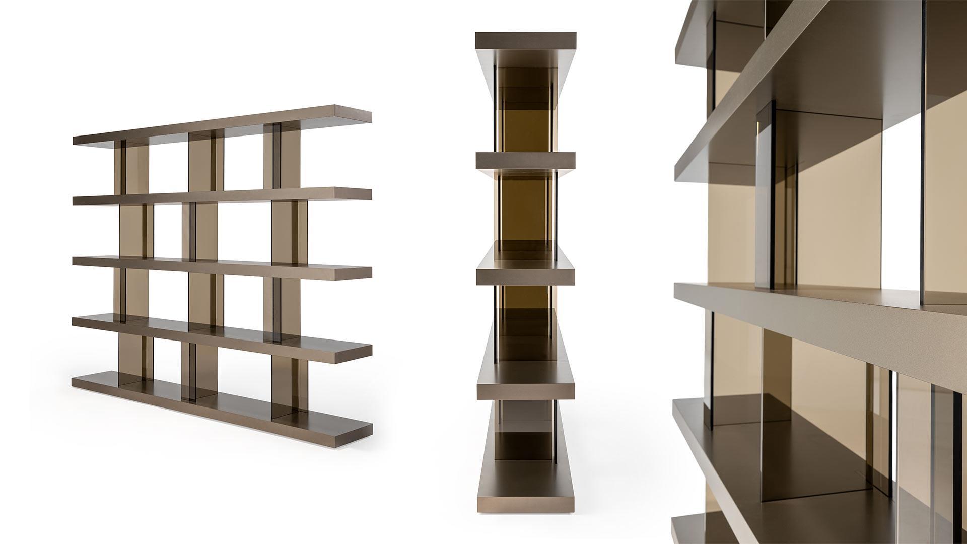 Стеллаж TANGO T от итальянской фабрики REFLEXANGELO — элегантное решение для хранения с премиальными материалами. Деревянные полки доступны в благородных вариантах отделки: бронза, латунь, темная латунь или титан. Итальянское качество гарантирует долговечность и безупречный дизайн.