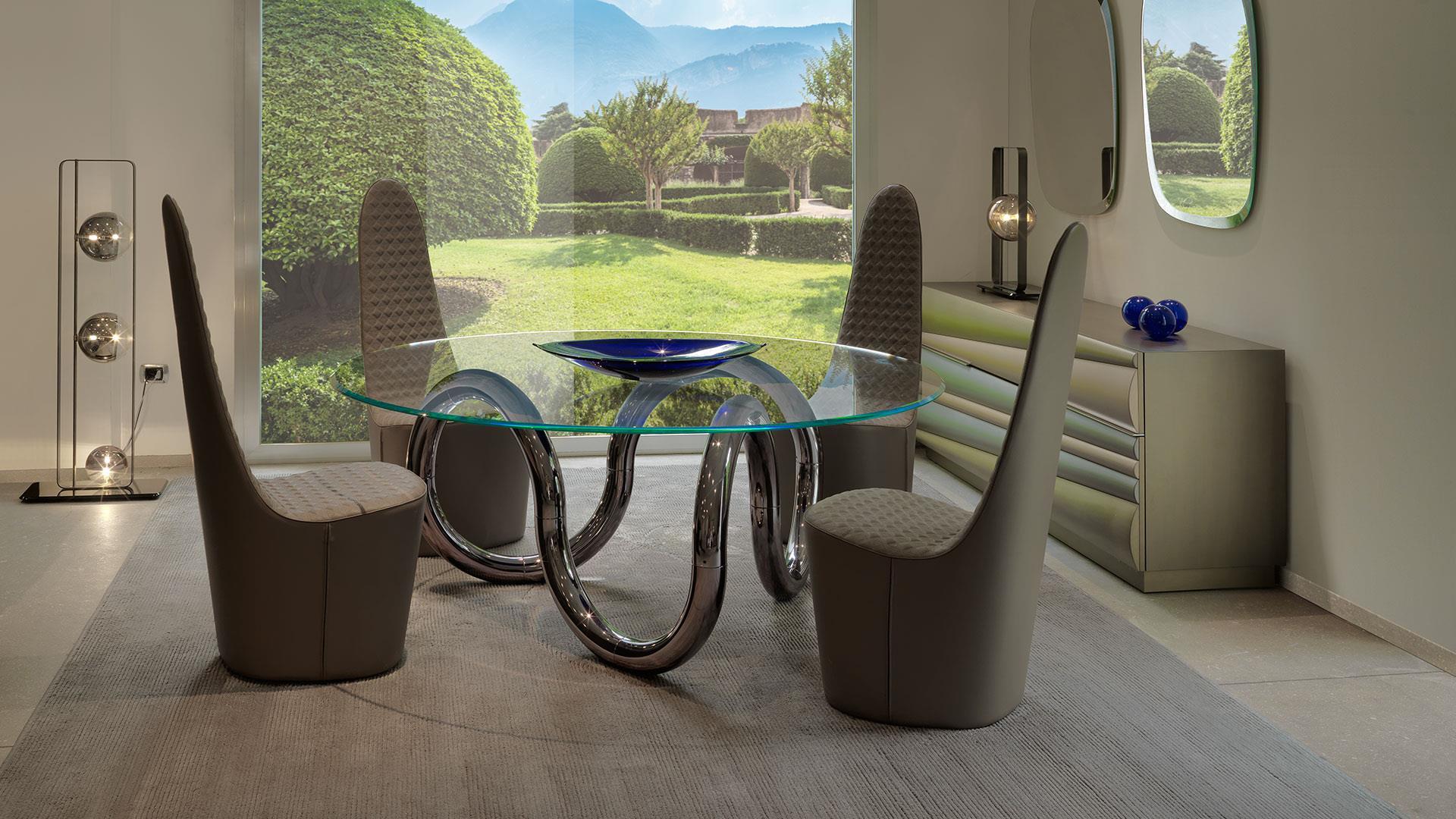 Обеденный стол AENIGMA от итальянской фабрики REFLEXANGELO — элегантное решение для современного интерьера. Основание с элементами формы доступно в глянцевом исполнении (черный никель или медь) или сатинированном (латунь, темная латунь). Верх из прозрачного стекла толщиной 15 мм подчеркивает легкость и стиль.