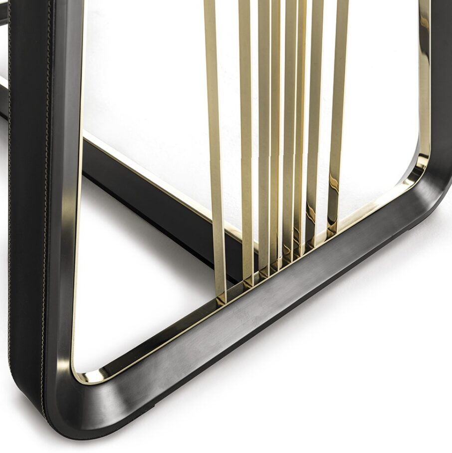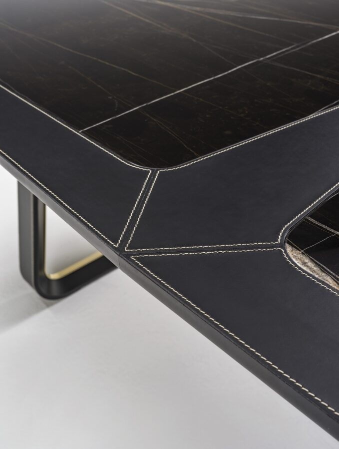 Стол AEQUIS выделяется своей мраморной столешницей, обрамленной изысканным кожаным профилем. Эта комбинация материалов не только придает изделию уникальный внешний вид, но и подчеркивает его статус. Основание стола, обогащенное внутренней сеткой, добавляет дополнительную нотку элегантности, делая его не просто мебелью, а настоящим искусством в вашем доме.