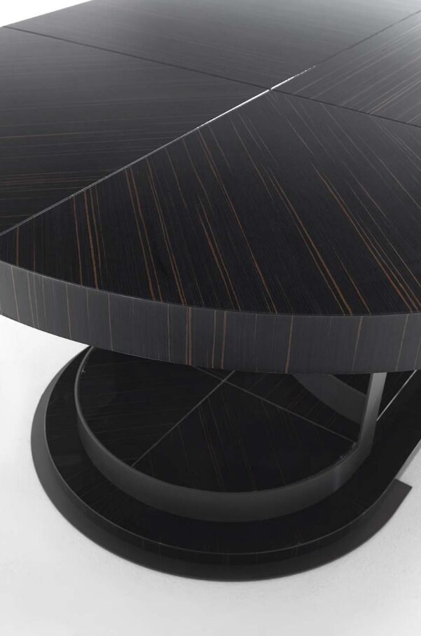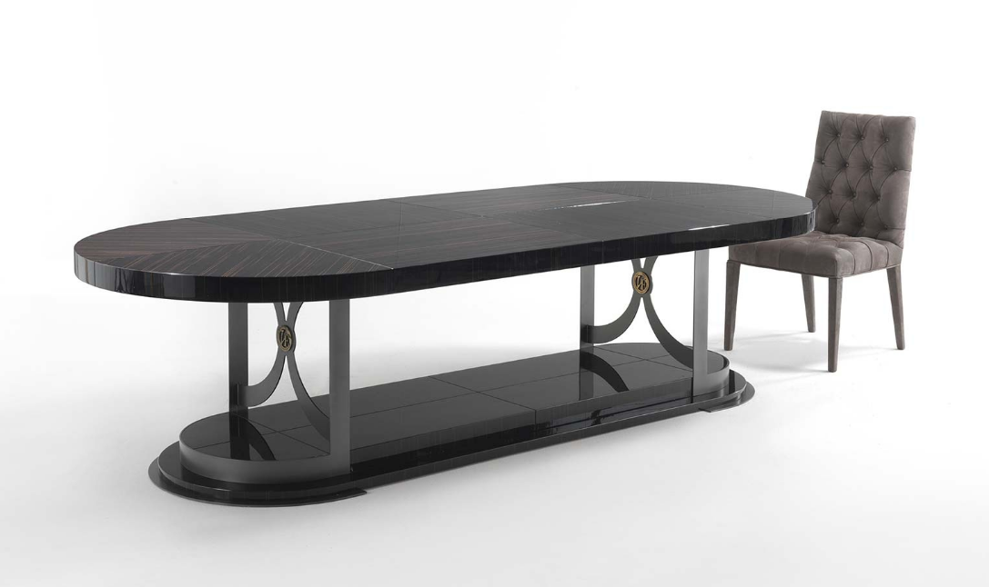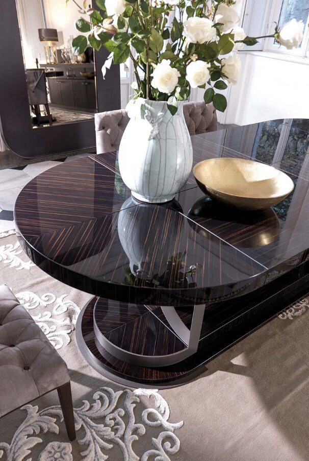 Стол ARAGONA от итальянской фабрики Vittoria Frigerio — это великолепное сочетание изысканного дизайна и высококачественных материалов. Изготовленный из черного дерева или эрбея, он отличается уникальными округлыми формами и узорами, которые придают ему неповторимый шарм.