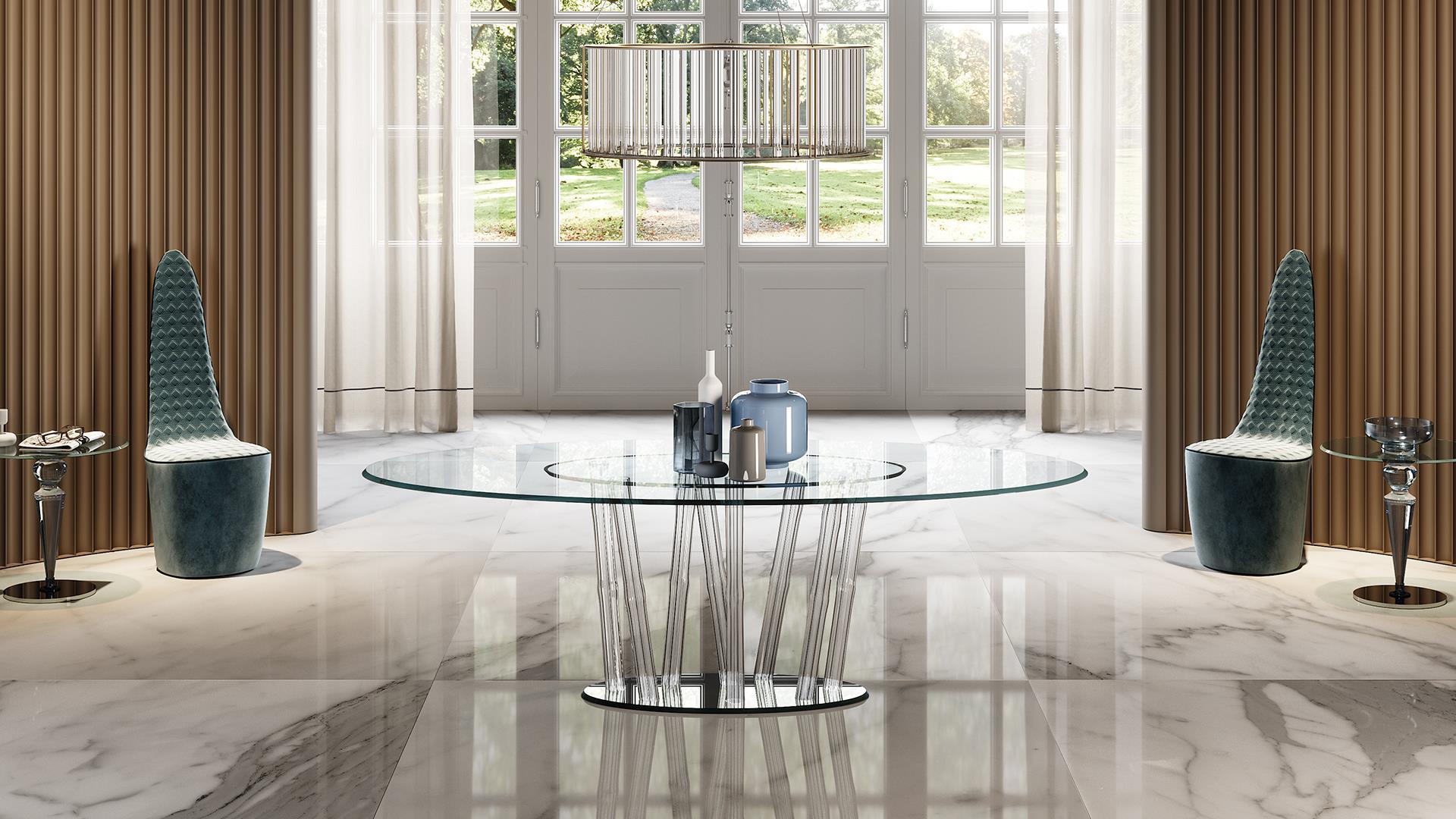 Обеденный стол BAMBOO 72 от итальянской фабрики REFLEXANGELO – воплощение элегантности и инновационного дизайна. Столешница из экстра-прозрачного стекла толщиной 15 мм дополнена декоративными элементами из стеклянных палочек Мурано, создающими эффект воздушности.