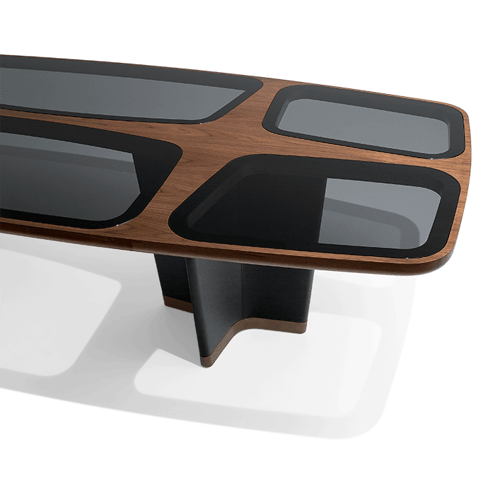 Изготовленный из грецкого ореха и роскошной кожи Canaletto, стол доступен в различных вариантах отделки. Вы можете выбрать верх, выполненный полностью из грецкого ореха или дополненный вставками из кожи, хрусталя, мрамора, а также сапелли. Эти благородные материалы не только обеспечивают долговечность, но и создают атмосферу уюта и респектабельности, которую оценят ваши гости.