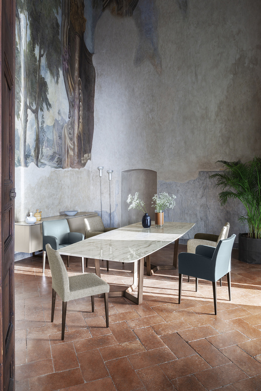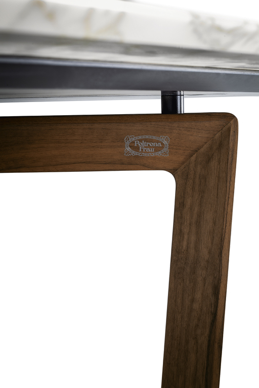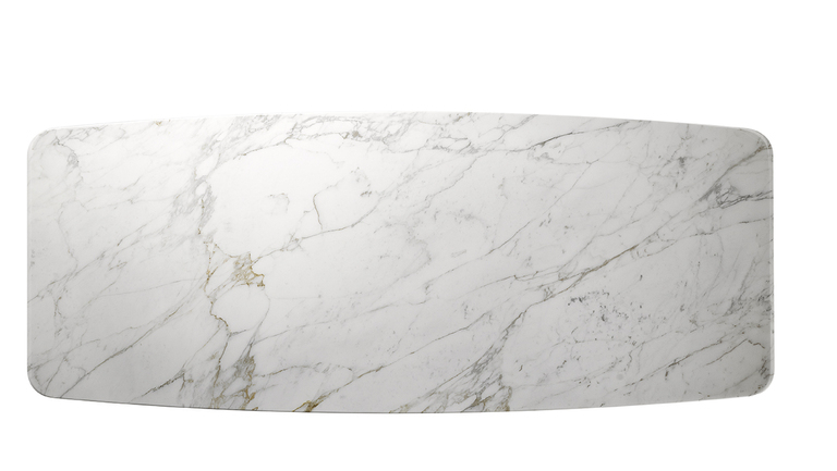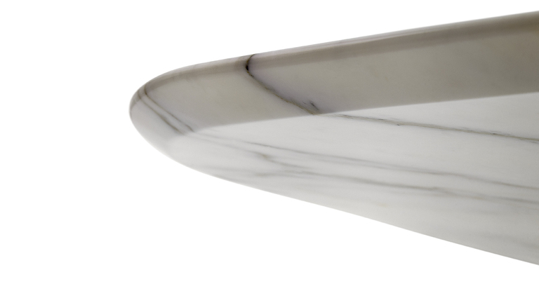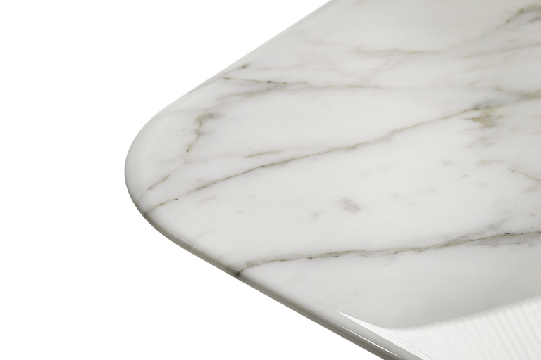 Столешница стола изготовлена из цельной плиты бочкообразного мрамора с коническими краями, что подчеркивает его эксклюзивность. Доступные варианты мрамора Calacatta Oro и Fior di Pesco доступны с полированной отделкой, которая защищает поверхность от впитывания жидкостей, или с полуполированной отделкой, обработанной водоотталкивающим маслом. Нижняя поверхность столешницы имеет техническую сетку, что гарантирует ее прочность и долговечность.