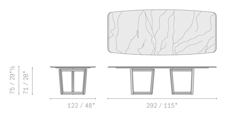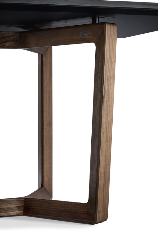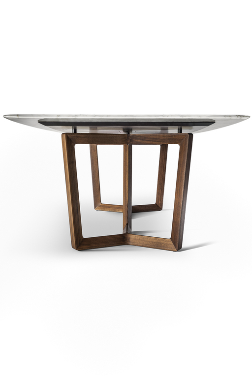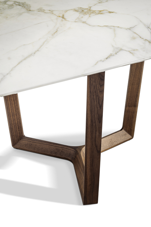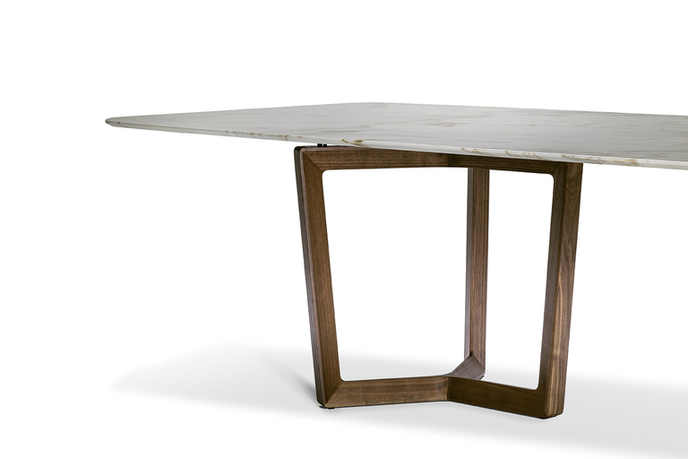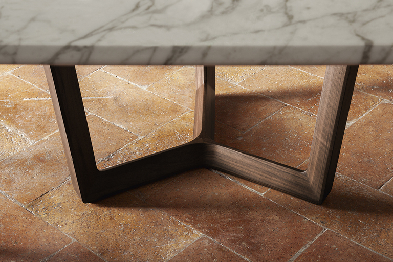 Стол имеет уникальную самонесущую конструкцию с треугольными ножками из массива ясеня или ореха. Столешница из цельной плиты бочкообразного мрамора, доступная в вариантах Calacatta Oro и Fior di Pesco, придаёт изделию эксклюзивность и стиль.