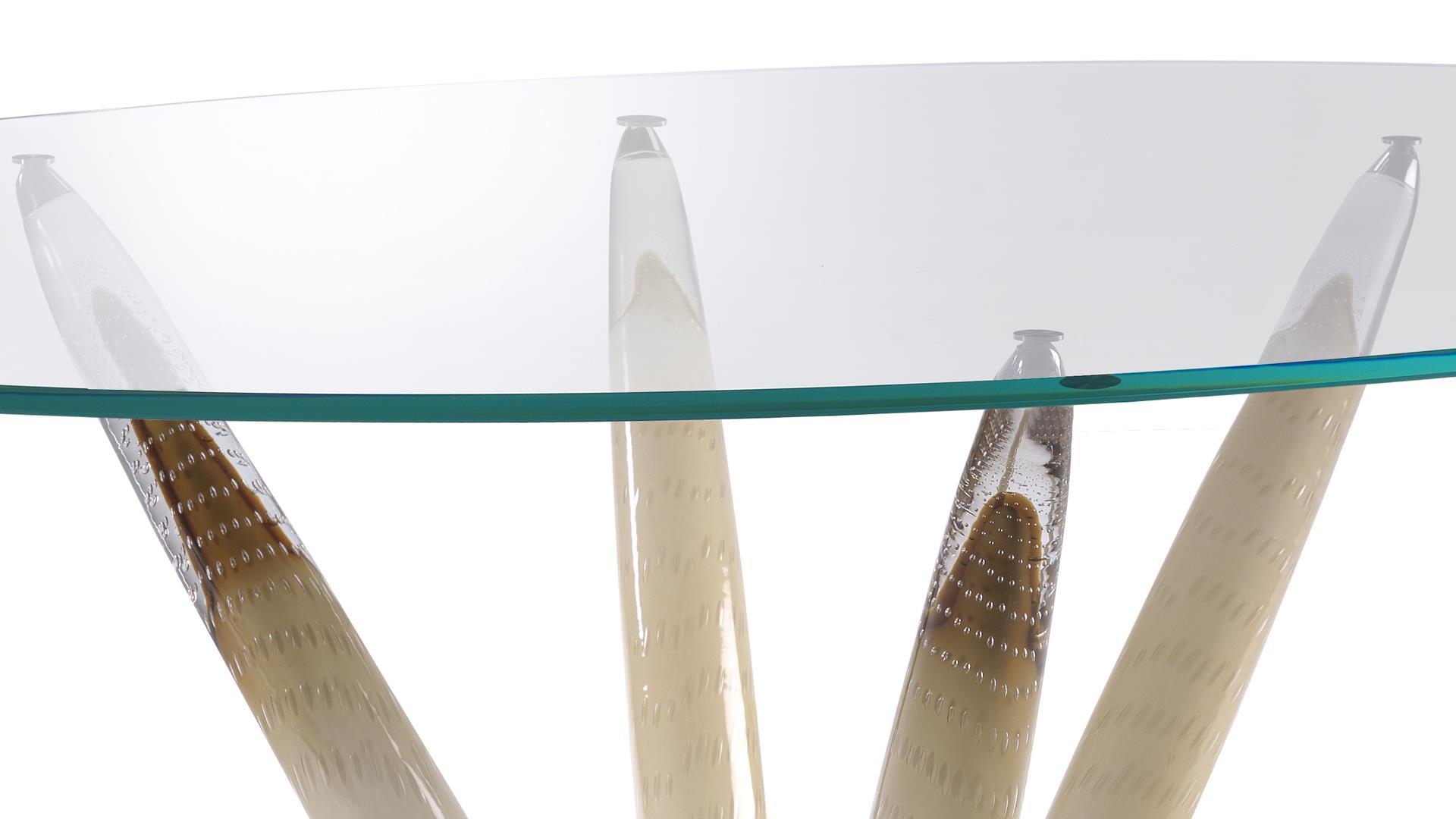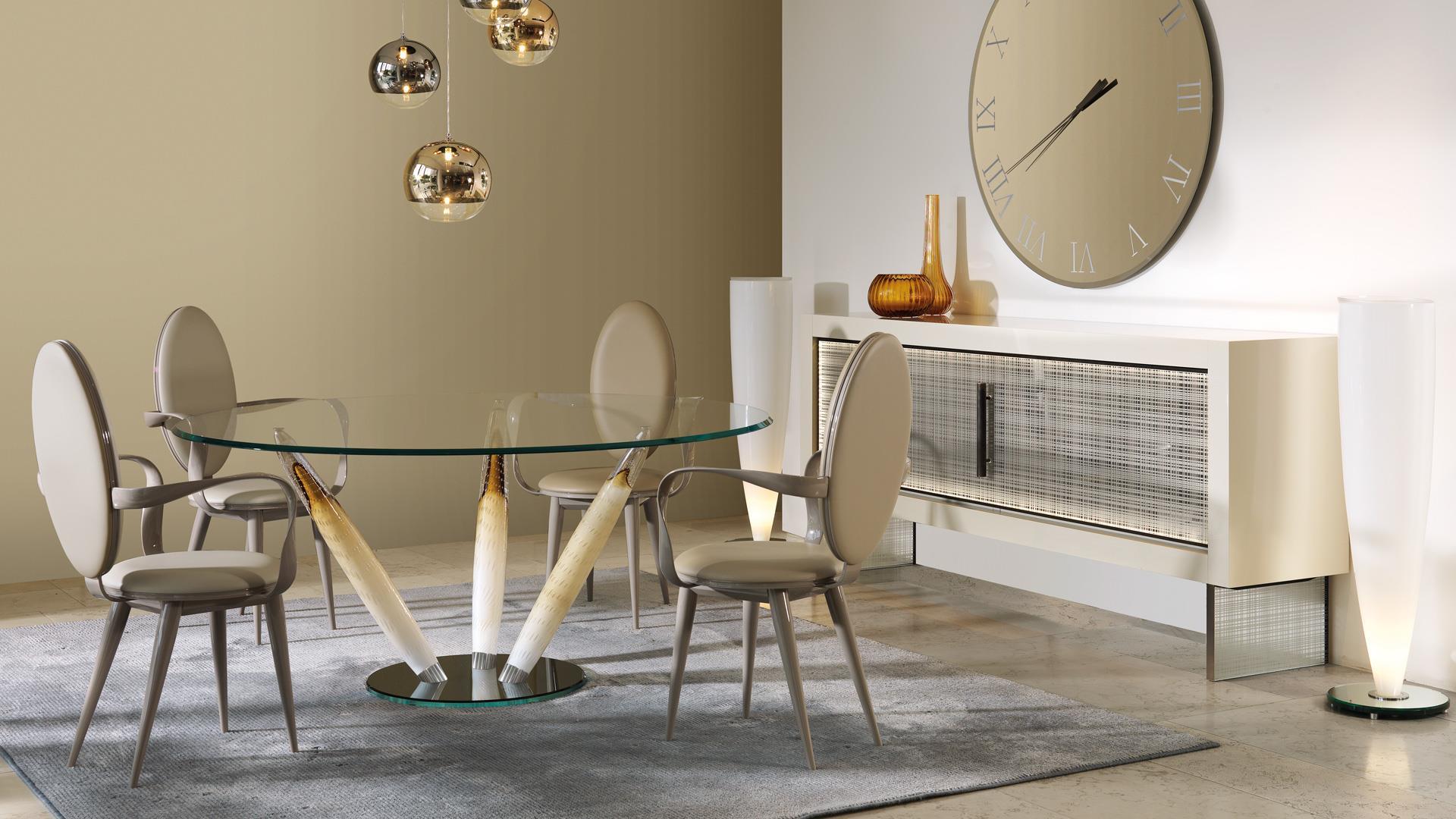 Обеденный стол CADORO от итальянской фабрики REFLEXANGELO — элегантное сочетание современных технологий и традиционного мастерства. Стол отличается прозрачной стеклянной столешницей, которая эффектно контрастирует с мурано стеклянными ножками в оттенке капучино и копченым зеркальным основанием. Итальянский дизайн подчеркивает утонченность и премиальное качество материалов.