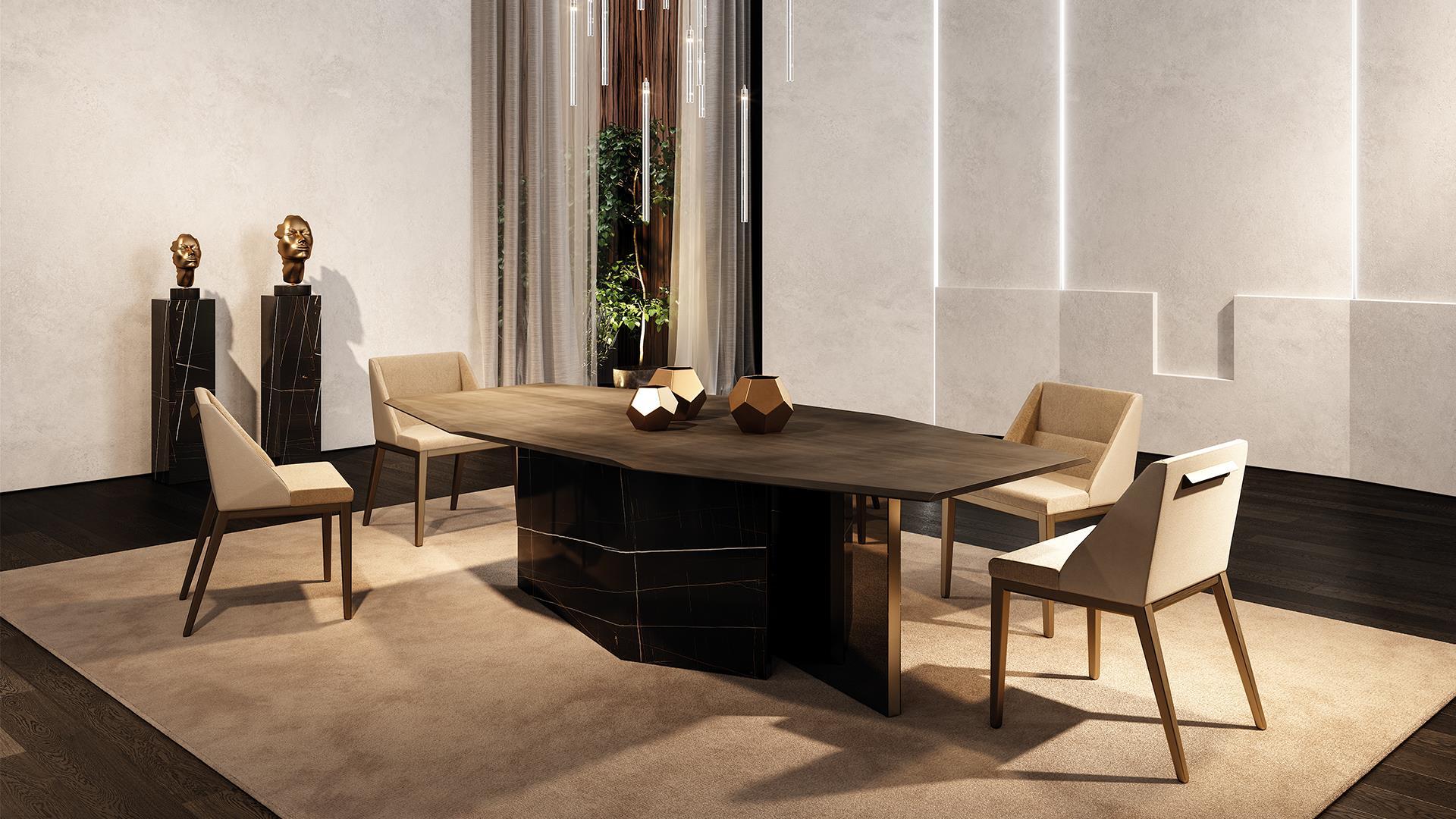 Обеденный стол CIBITUM 72 от итальянской фабрики REFLEXANGELO – воплощение элегантности и роскоши. Деревянное основание с бронзовой окантовкой и зеркальной внутренней стороной создаёт эффектный контраст с внешней поверхностью MarbleReflex, имитирующей благородный мрамор.