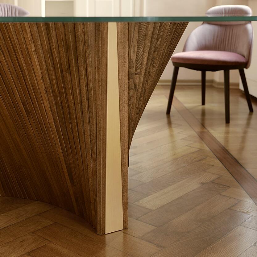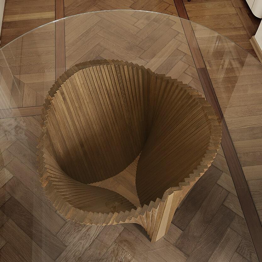 Обеденный стол Clover Reverse от итальянской фабрики NOVAMOBILI – воплощение элегантности и инновационного дизайна. Основание в форме перевернутых листьев клевера с тройной волной деревянных полос создает эффектный визуальный акцент. Круглая столешница из прозрачного закаленного стекла подчеркивает изысканность конструкции, а золотая вставка добавляет ноту роскоши.