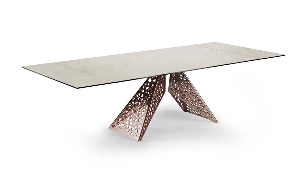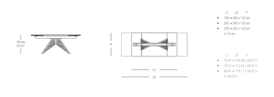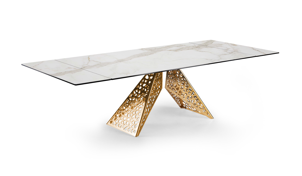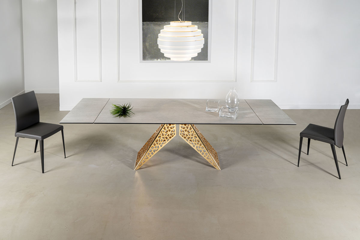 Стол COLISEUM имеет удлинённую форму, что обеспечивает комфортное размещение гостей. Его хрустальный верх придаёт пространству лёгкость и изящество, а металлические рельсы, окрашенные в благородные оттенки, добавляют современный штрих. Простая, но гениальная конструкция стола оснащена запатентованным механизмом, который позволяет легко извлекать боковые расширения, увеличивая поверхность стола на 80 см. Это великолепное решение для тех, кто любит устраивать праздничные ужины и встречи с близкими.