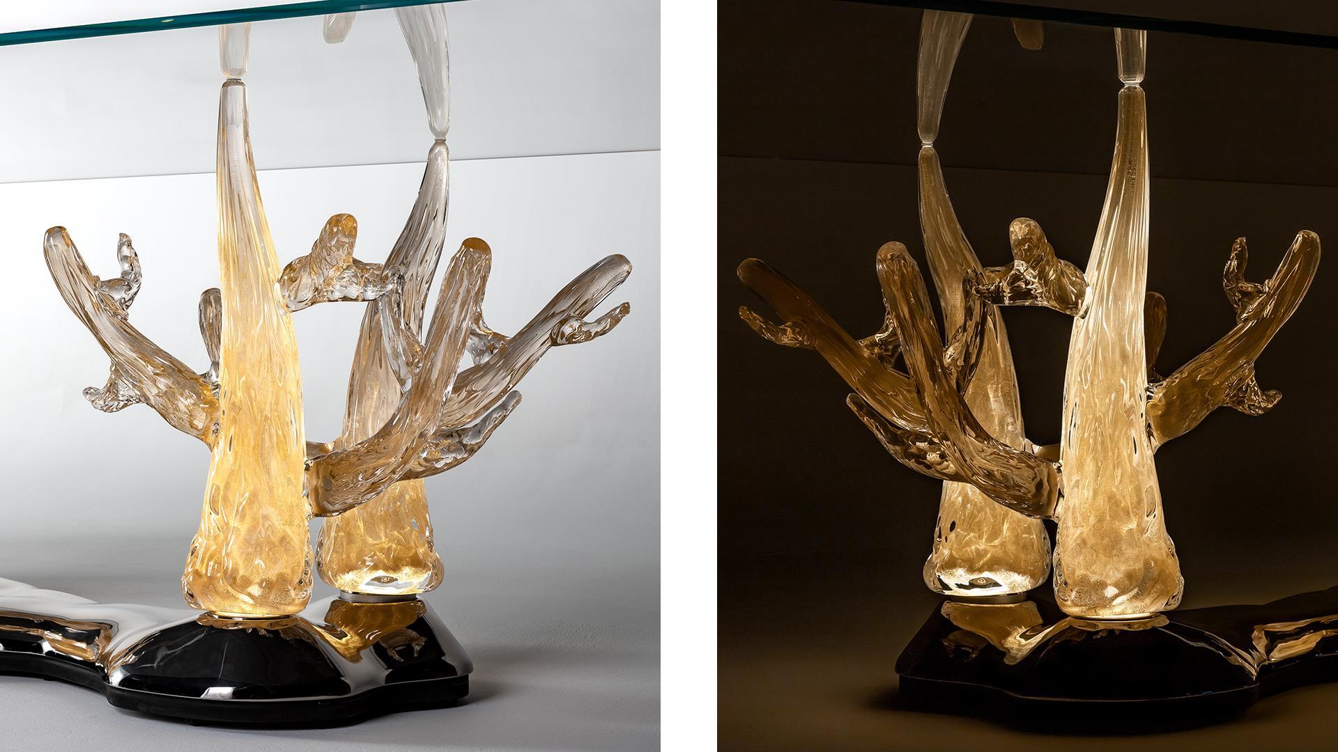 Обеденный стол CORALLO BESPOKE от итальянской фабрики REFLEXANGELO — воплощение роскоши и мастерства. Основание из золотого стекла Мурано ручной работы дополнено хромированным плинтусом со встроенной светодиодной подсветкой, создающей эффектное освещение. Стеклянная столешница толщиной 15 мм с фаской 45 градусов придает столу элегантность и визуальную легкость.
