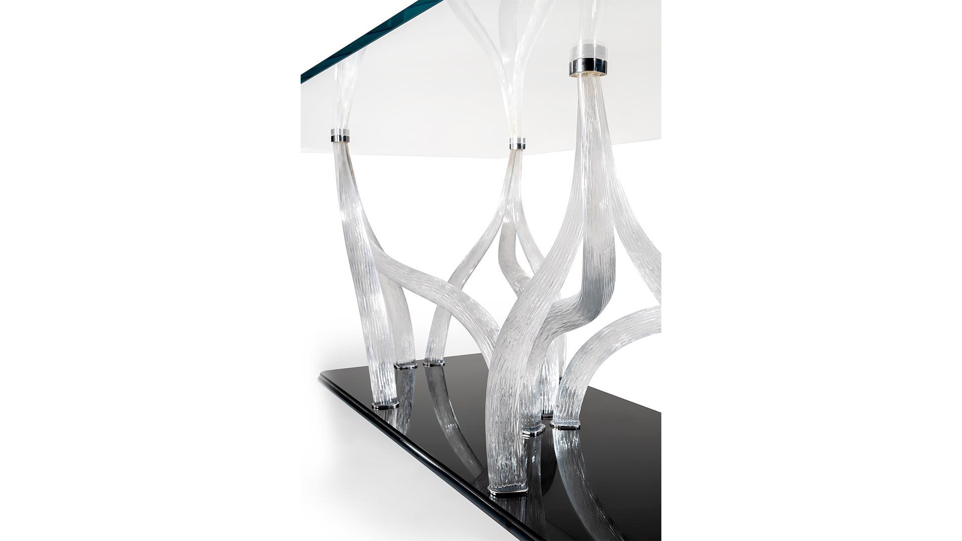 Обеденный стол FLAMBE 72 от итальянской фабрики REFLEXANGELO — воплощение роскоши и мастерства. Стол выполнен с использованием прозрачного стекла Мурано ручной работы или декоративных золотых элементов. Топ толщиной 15 мм из экстра-чистого хрусталя придает модели изысканность, а опциональная алмазная гравировка усиливает её премиальный статус.