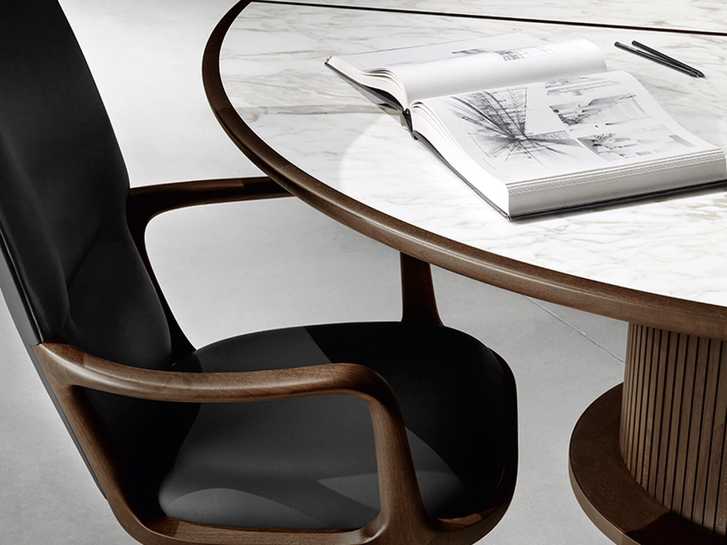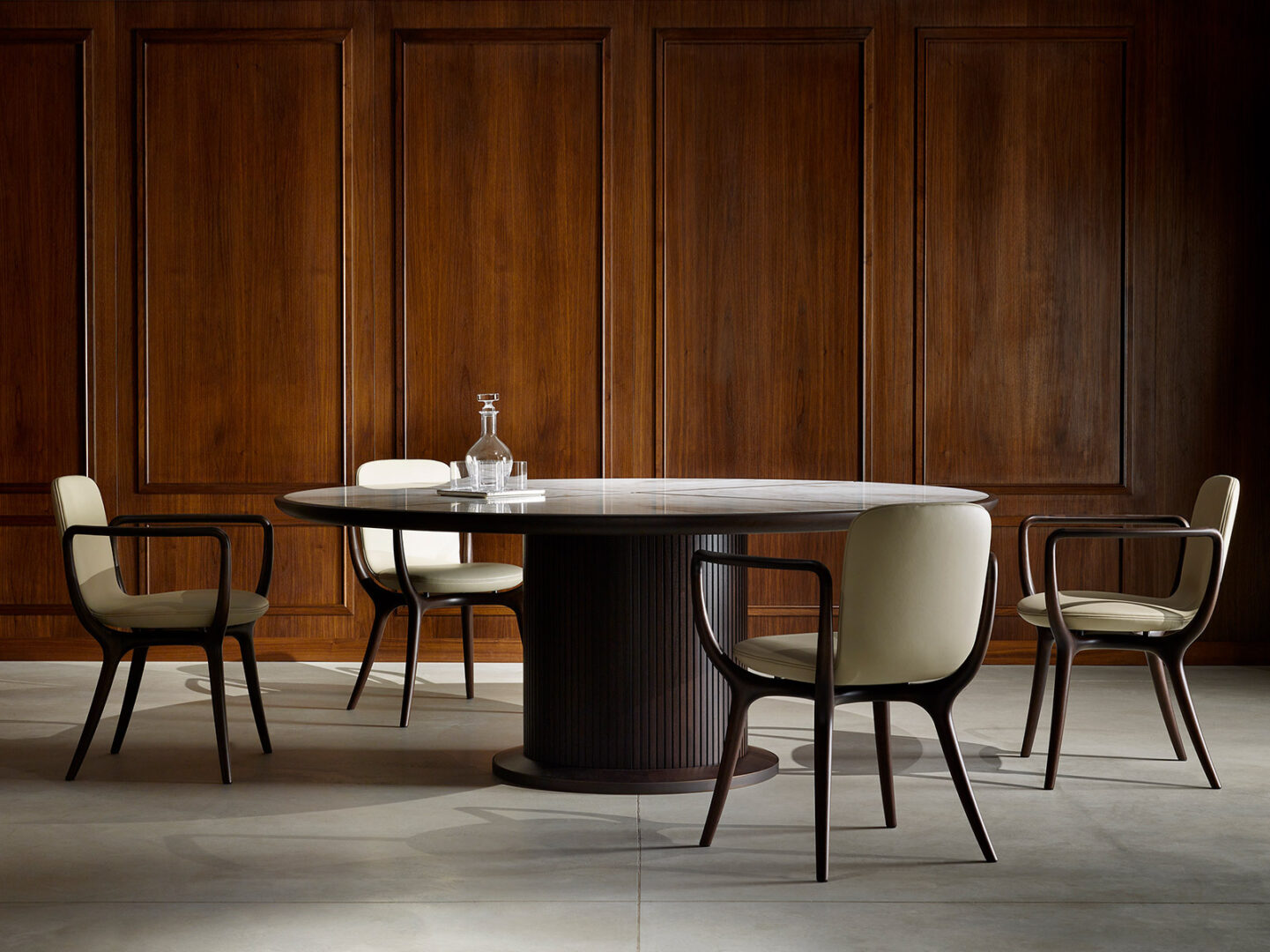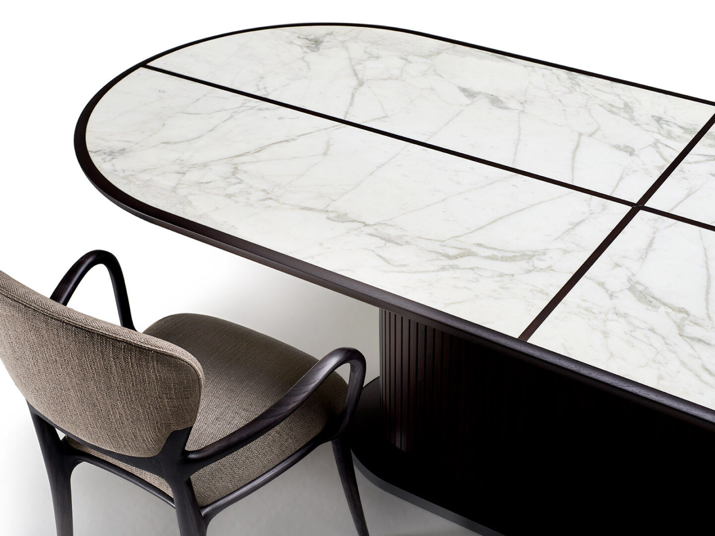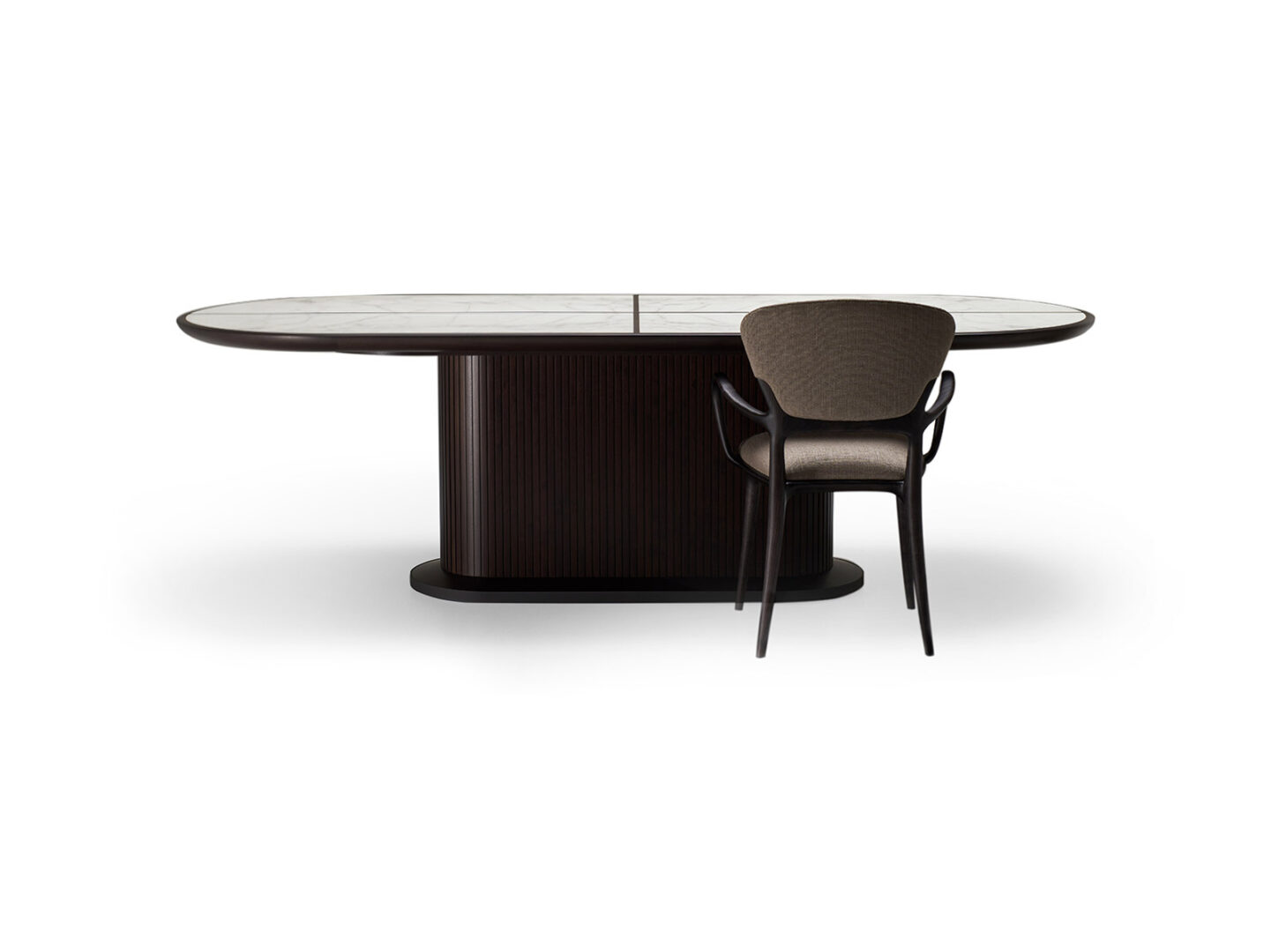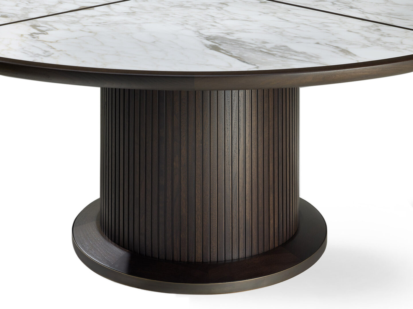 Стол FULL выделяется своей утонченной формой и изысканной отделкой. Основание, покрытое полосками твердого американского грецкого ореха, придает ему особый шарм, а каркас из полированной латуни подчеркивает его статусность и долговечность. Вы можете выбрать одну из нескольких вариантов отделки столешницы: мрамор или дерево, что позволит вам адаптировать этот премиальный элемент под любой интерьер, будь то классика или современный стиль.