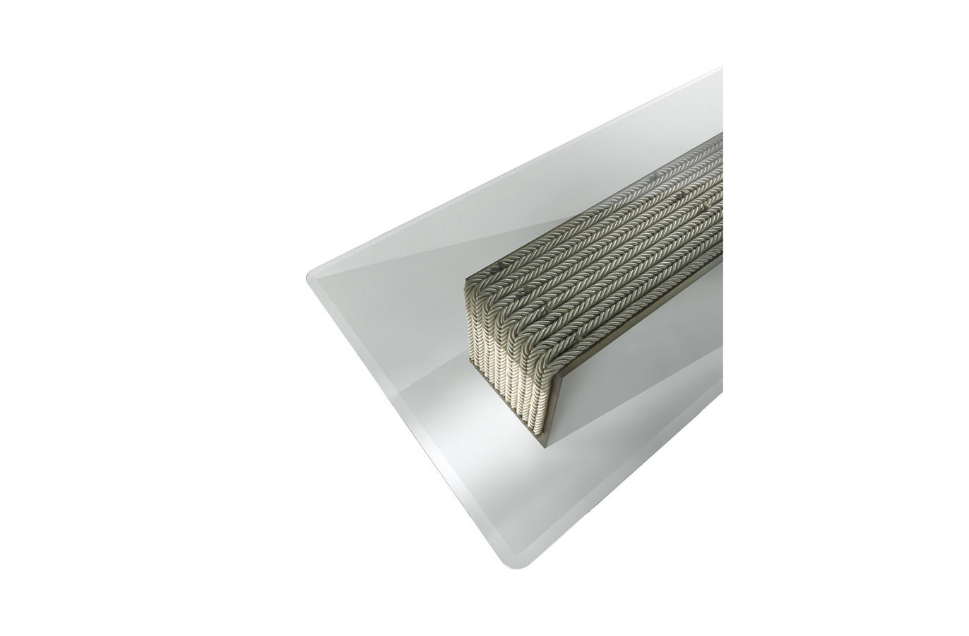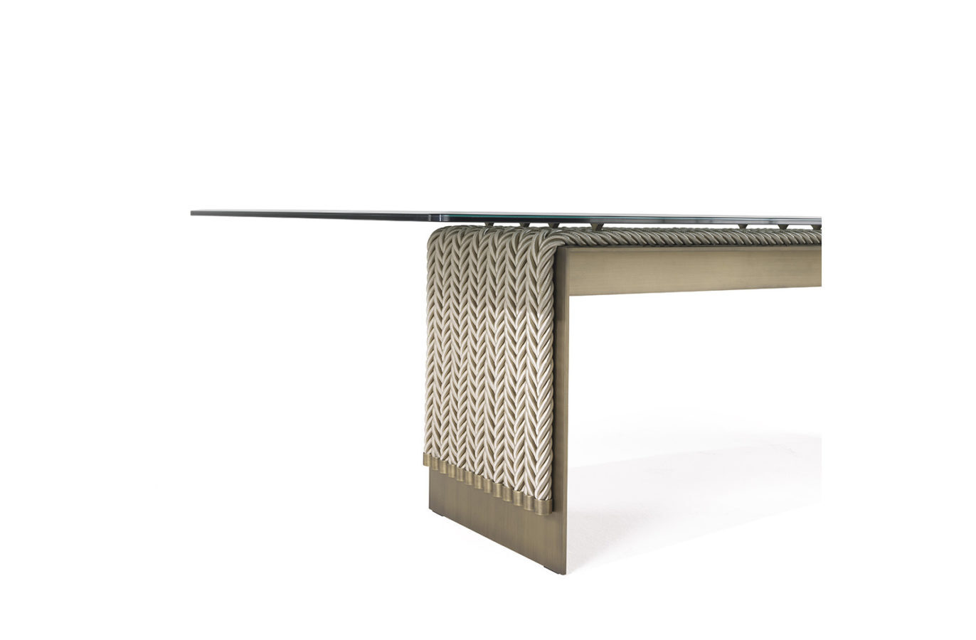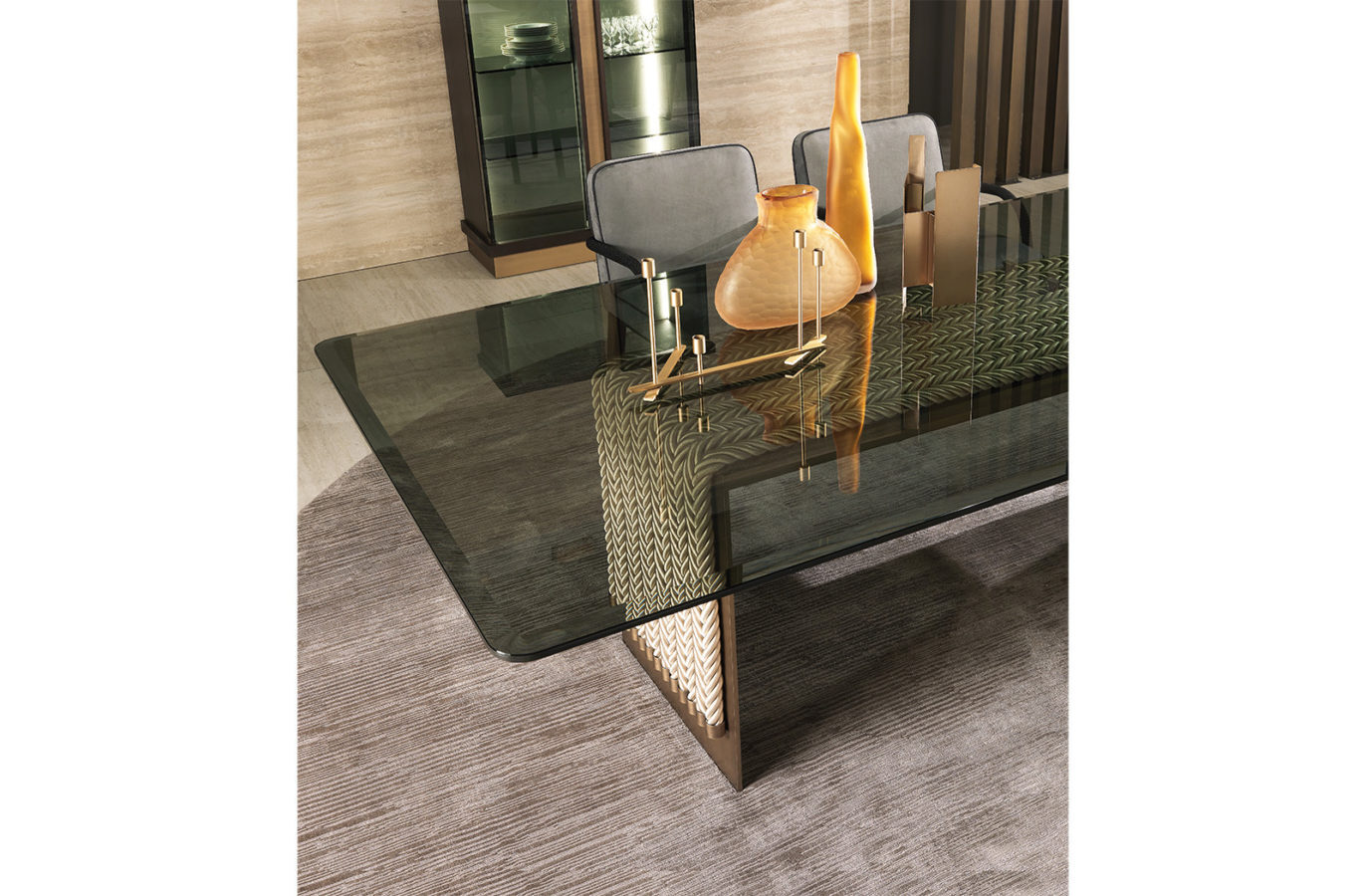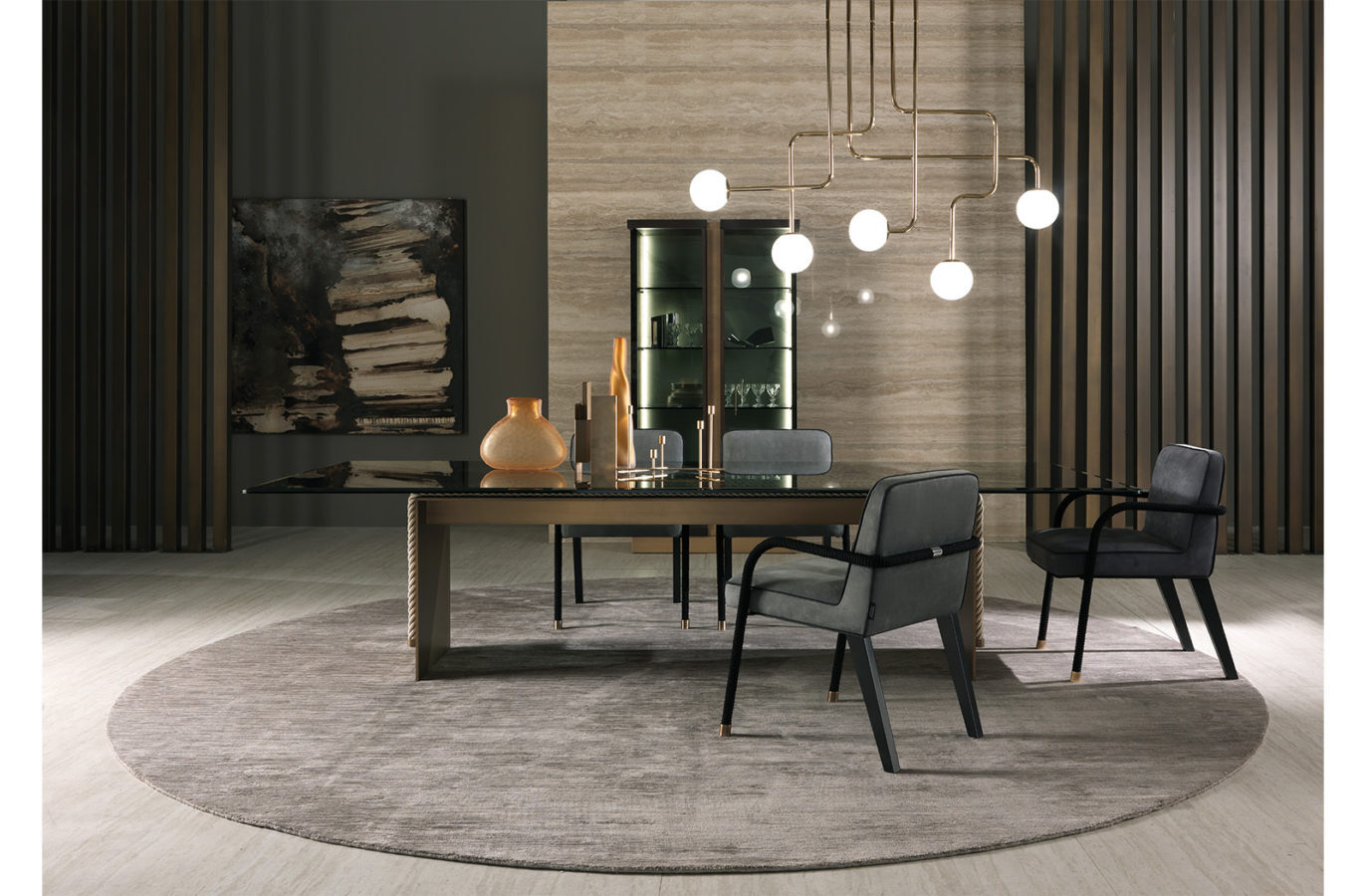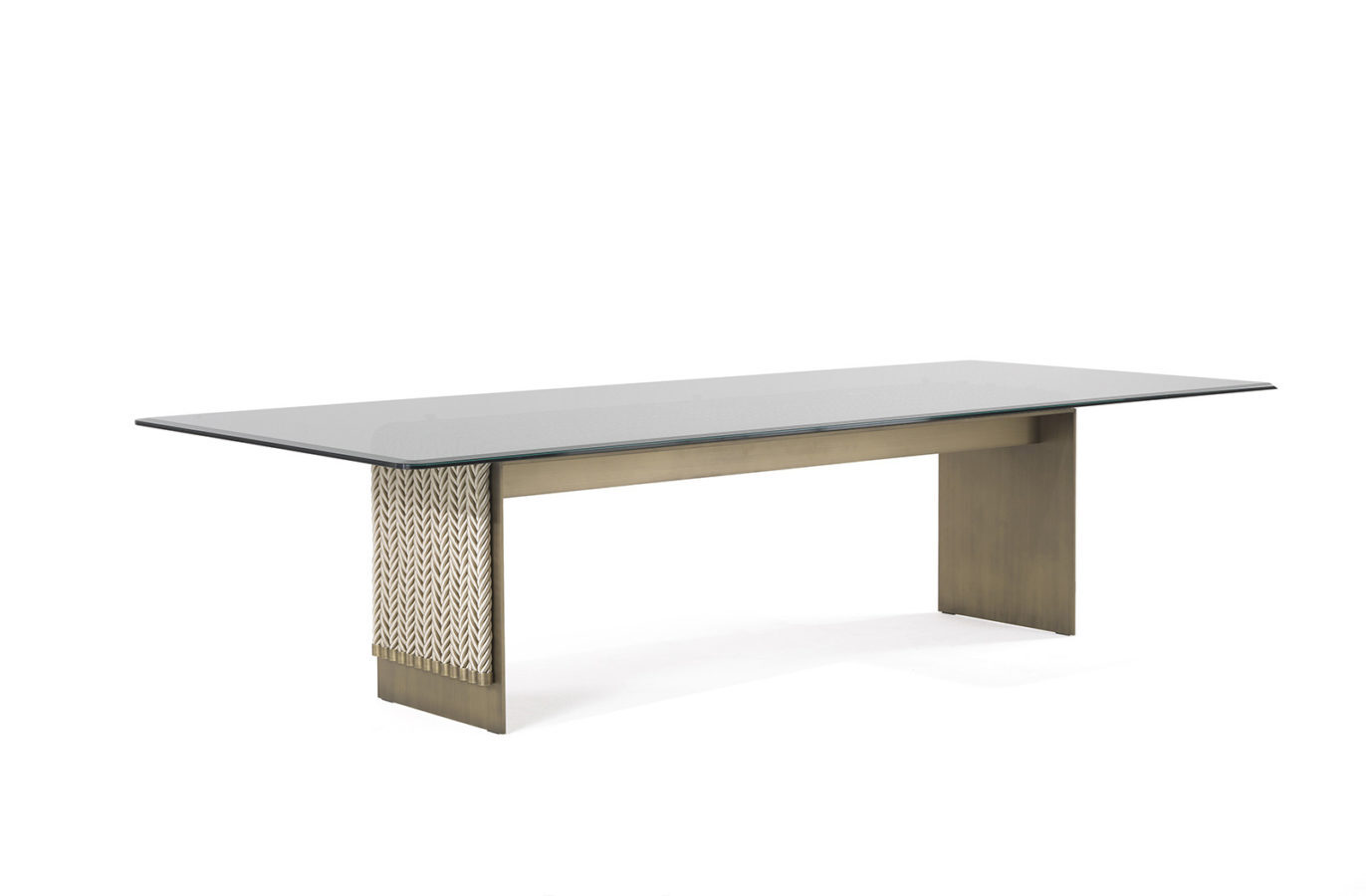 Обеденный стол Glasgow от итальянской фабрики Gianfranco Ferre Home — воплощение элегантности и инновационного дизайна. Представленный на Salone del Mobile 2018, он сочетает линейность форм с уникальной технологией изготовления. Столешница из экстра-прозрачного и копченого стекла дополнена декоративными струнами цвета шампань, а металлическая конструкция с матовой бронзовой отделкой придает столу изысканный шарм.