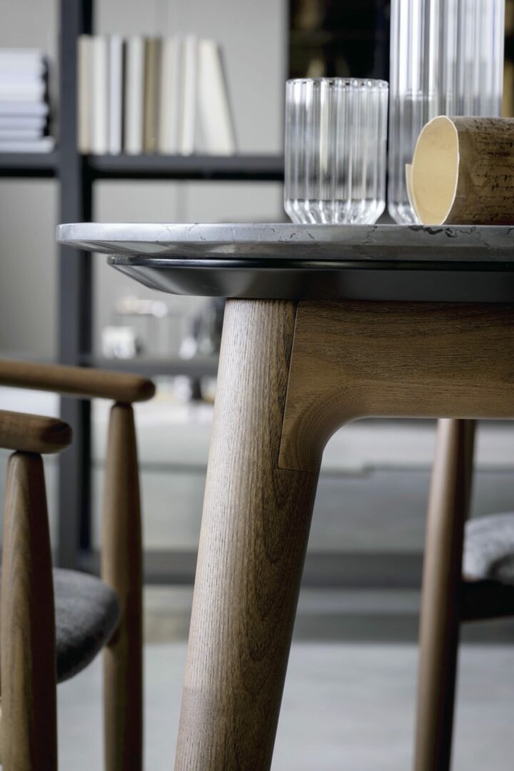 Столешница доступна в различных премиальных материалах: полированный или матовый мрамор Bianco Carrara, Grigio Oriente, verde Guatemala, матовый лавовый камень, а также ценные породы дерева — noce canaletto и rovere chiaro. Ножки выполнены в оттенках натурального дерева, подчеркивая итальянское мастерство и внимание к деталям.