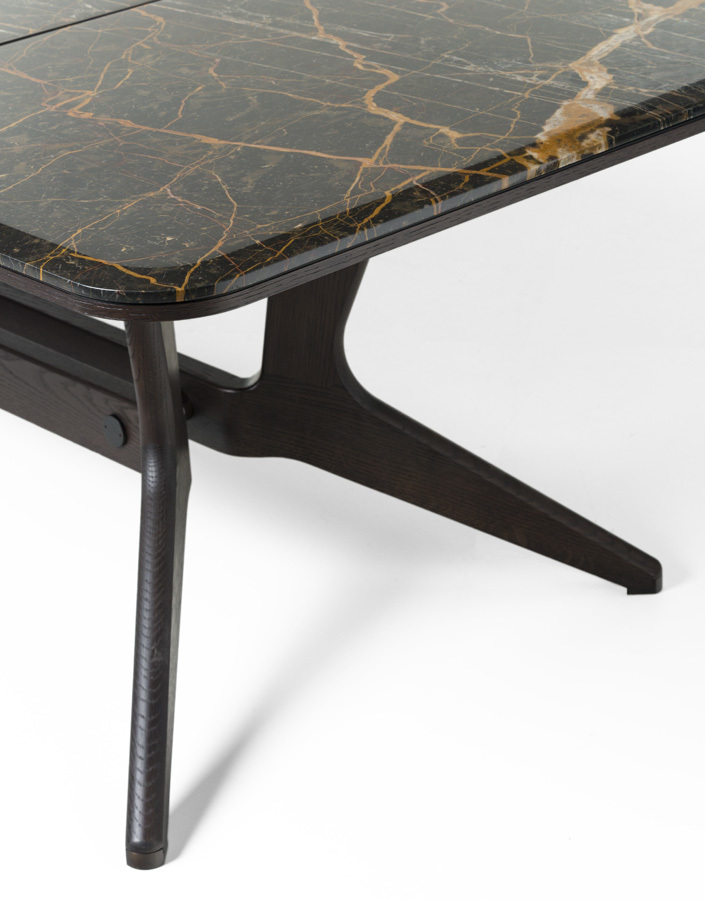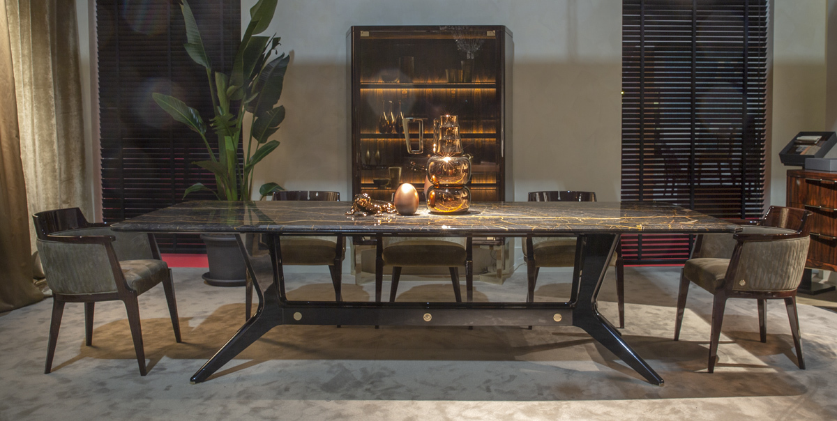 Обеденный стол HE405 от итальянской фабрики MEDEA — сочетание благородного дерева и бронзовых лакированных металлических вставок. Изысканный дизайн с продуманными деталями подчеркивает статус итальянского качества.