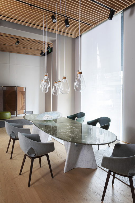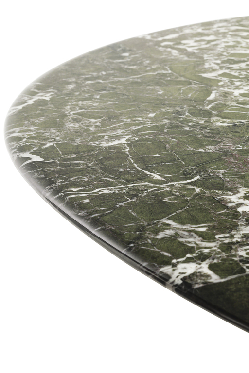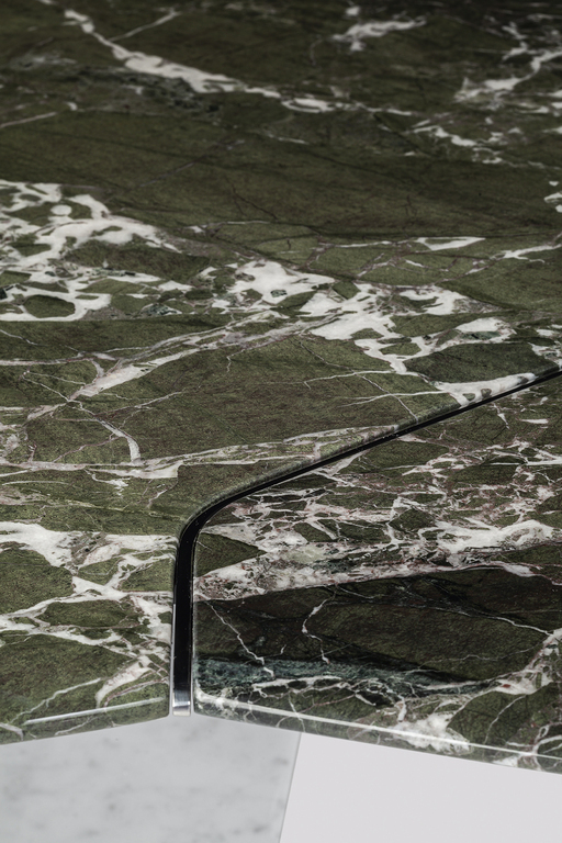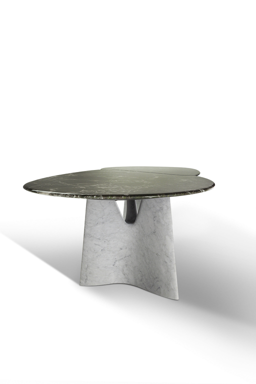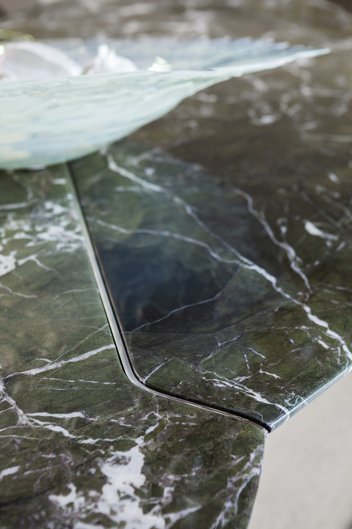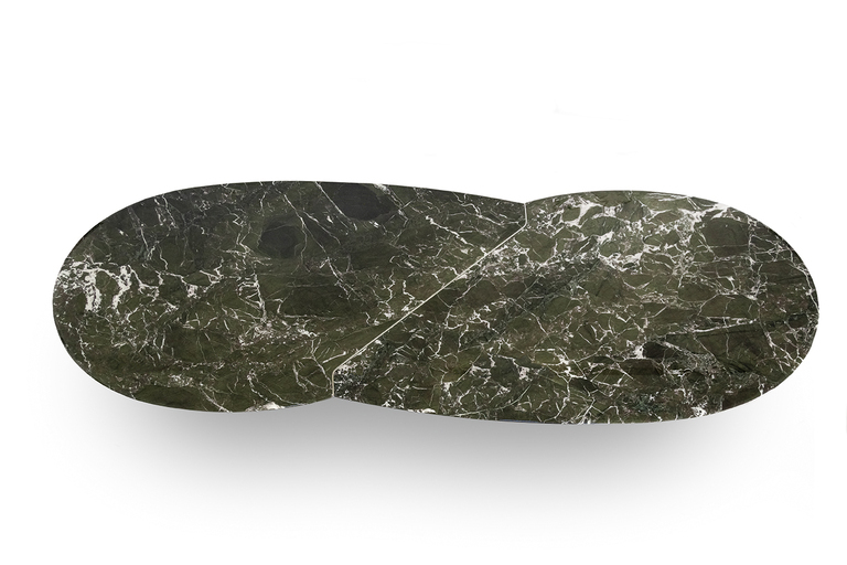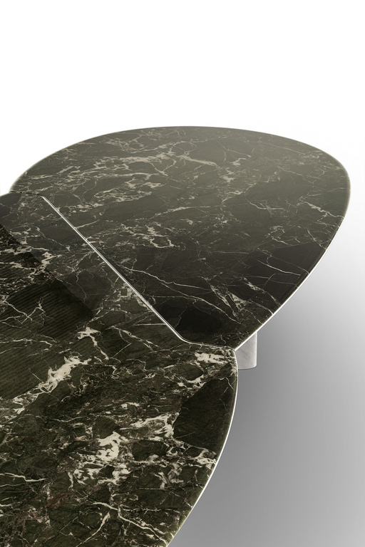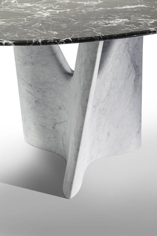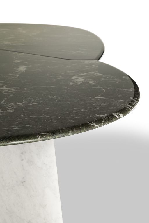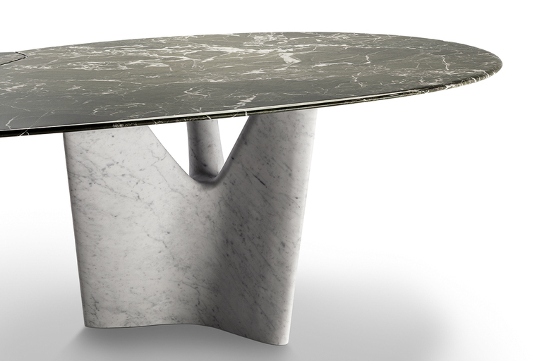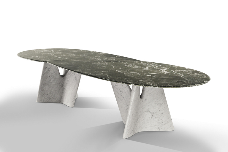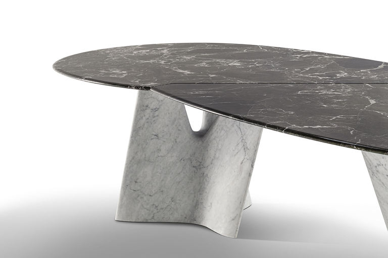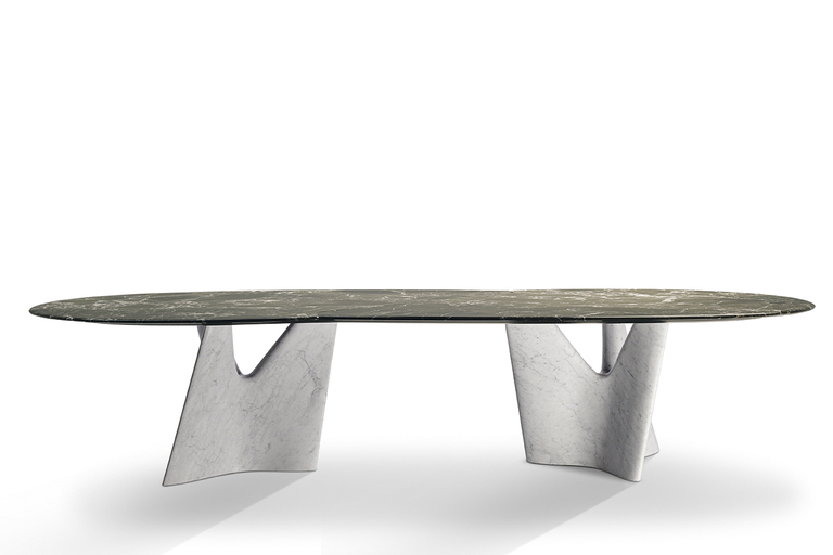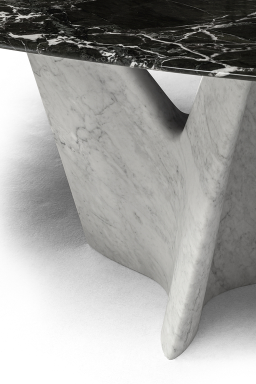 Сложная двойная овальная форма стола символизирует гармонию и бесконечность. Каждая ножка изготовлена из цельного блока белого каррарского мрамора, что придает изделию скульптурную элегантность. Столешница украшена тонким лезвием из нержавеющей стали, создающим эффект легкости.