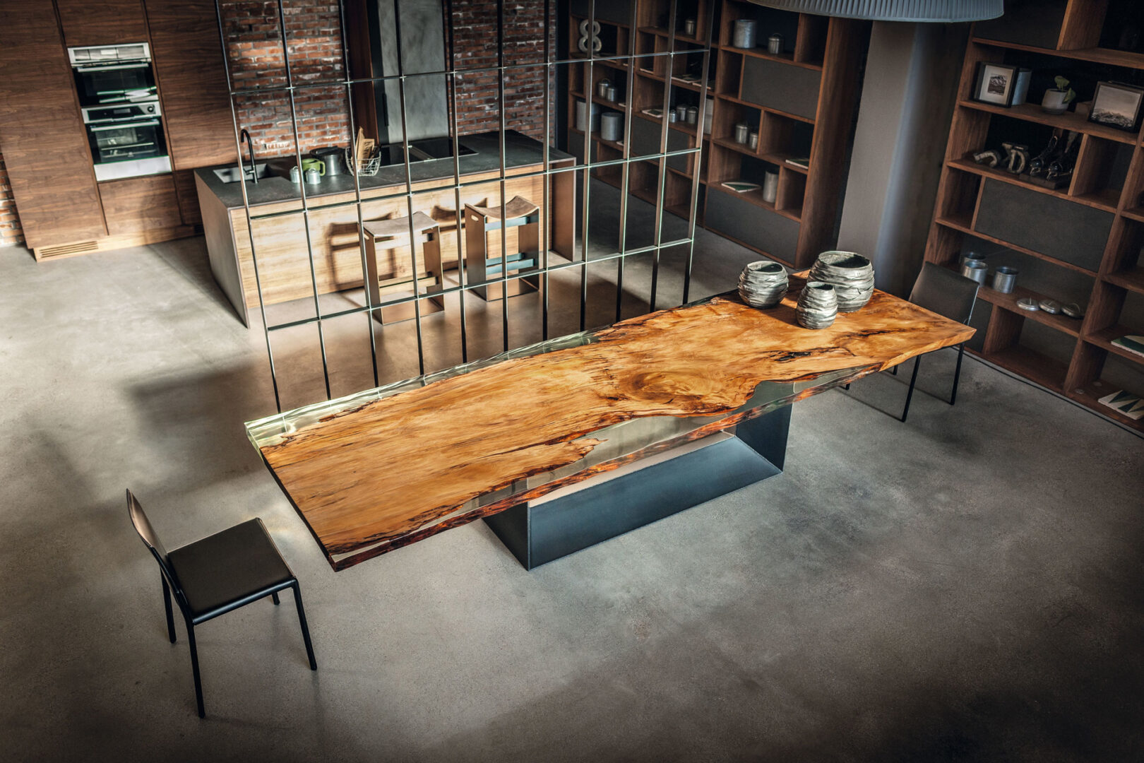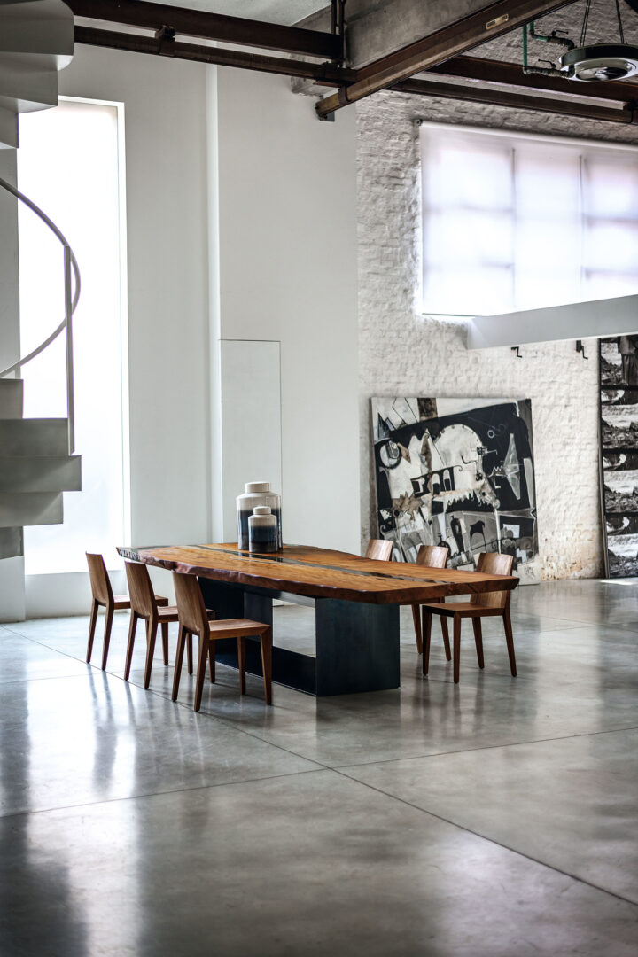 Стол KAURI CUBE от итальянской фабрики RIVA 1920 сочетает благородную древесину каури с современным металлическим основанием. Твердая столешница подчеркивает природную текстуру дерева, а железная опора с секцией саней придает мебели легкость и устойчивость.