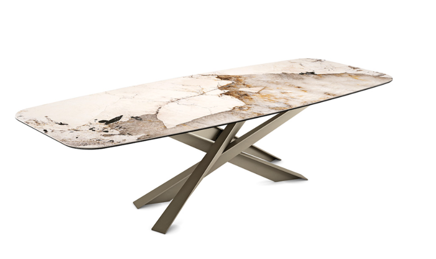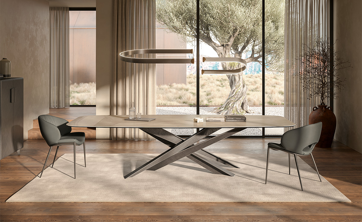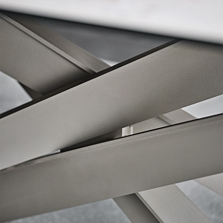 Стол LANCER KERAMIK от итальянской фабрики CATTELAN ITALIA — воплощение современного дизайна и архитектурной выразительности. Модель отличается скульптурной основой с пересекающимися металлическими лопастями, создающими динамичный светотеневой эффект. Столешница выполнена из керамики, подчеркивая премиальное качество и эстетику.