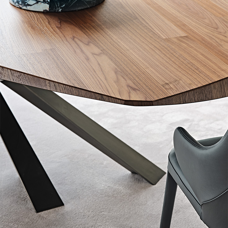 Стол LANCER WOOD от итальянской фабрики CATTELAN ITALIA – воплощение современного дизайна с архитектурной выразительностью. Модель отличается скульптурной основой с пересекающимися Т-образными ножками, создающими эффектную игру света и тени. Столешница из ценной древесины с тонко обработанными краями подчеркивает премиальное качество итальянского производства.