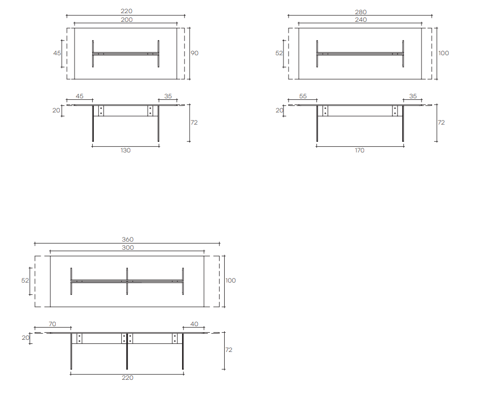 Доступен в различных размерах (до 360×100 см) с двумя или тремя ножками в зависимости от длины столешницы. Итальянское качество и лаконичная эстетика делают этот стол идеальным выбором для гостиных, столовых и ресторанов.