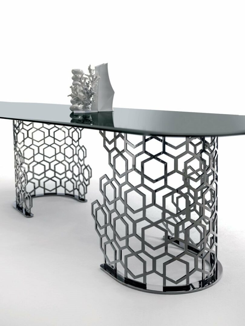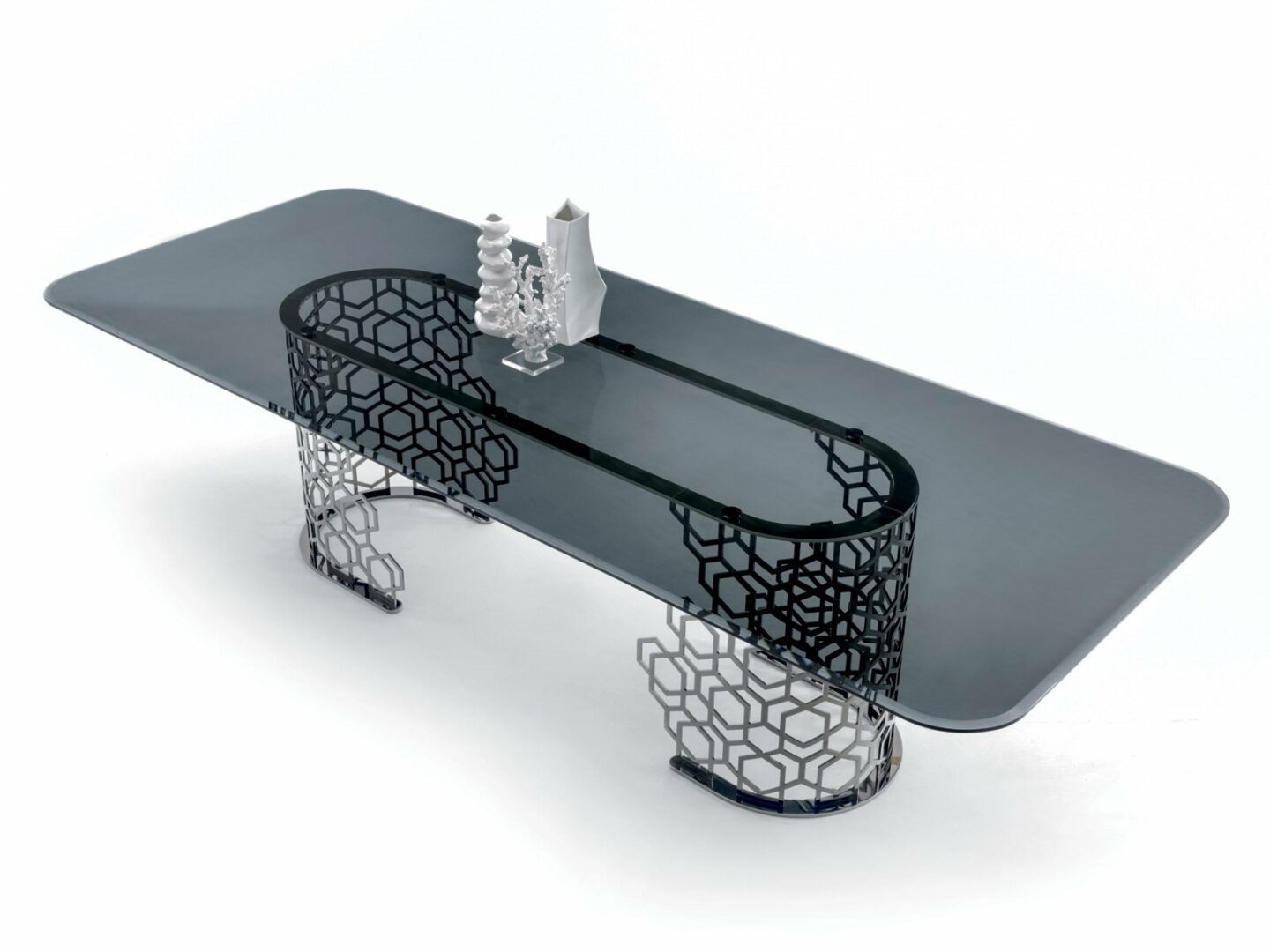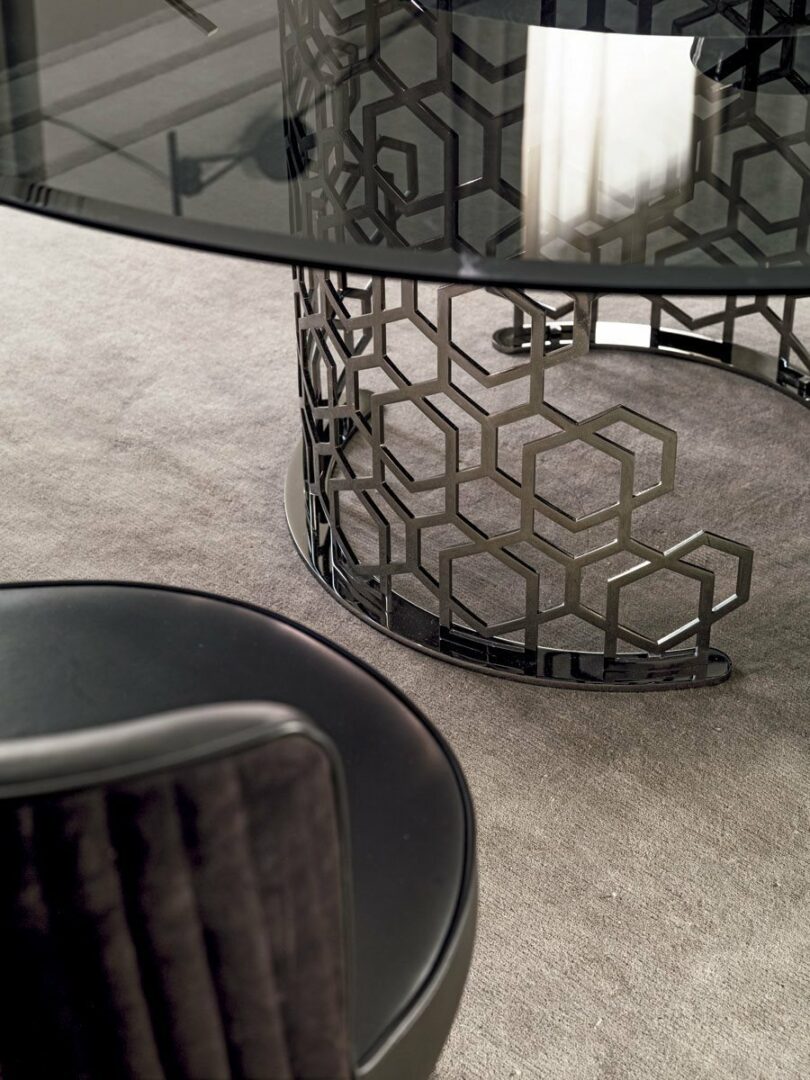 Стол MANFRED от итальянской фабрики LONGHI — это не просто мебель, а настоящее произведение искусства, создающее атмосферу роскоши и элегантности. Основание из шлифованного и гнутого металла с лазерным декором «Sequence» придаёт столу уникальный стиль. Выбор отделок каркаса и столешницы из высококачественных материалов, включая мрамор и закалённое стекло, позволяет создать индивидуальный интерьер.