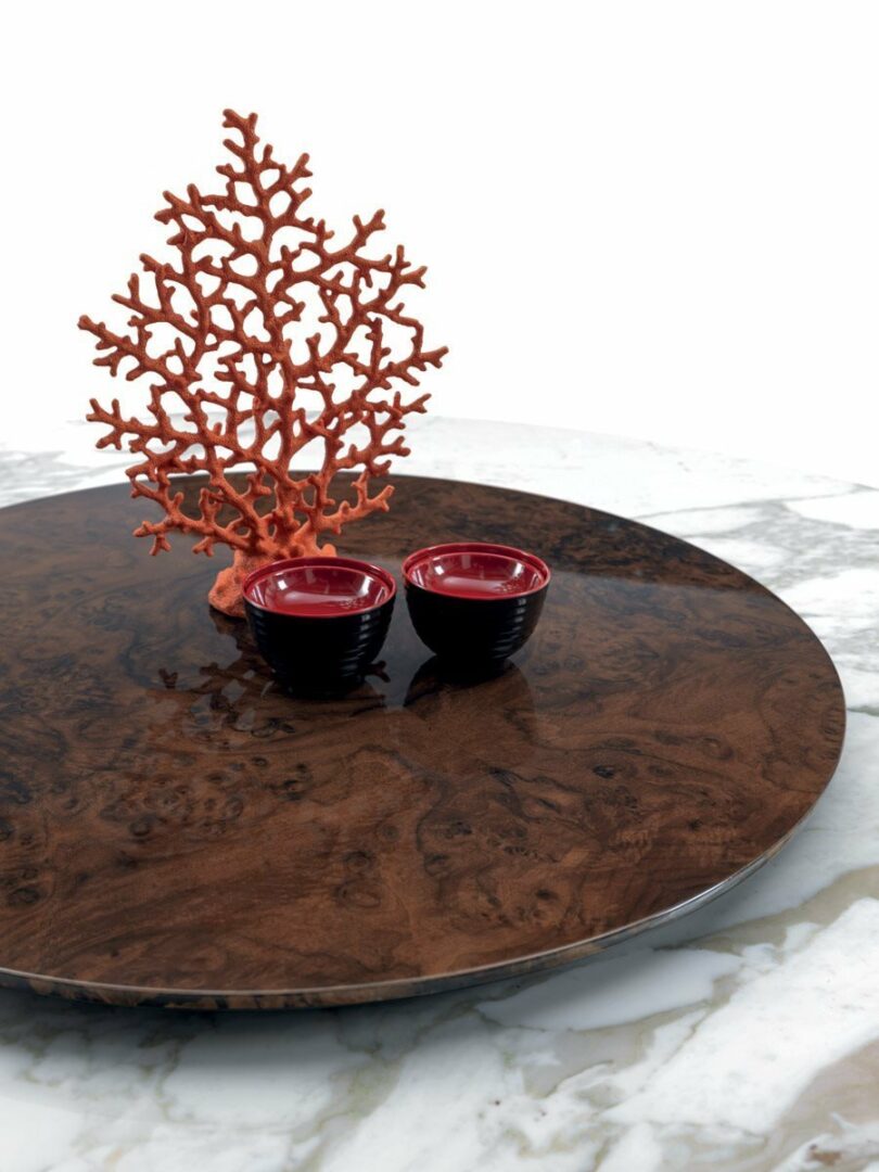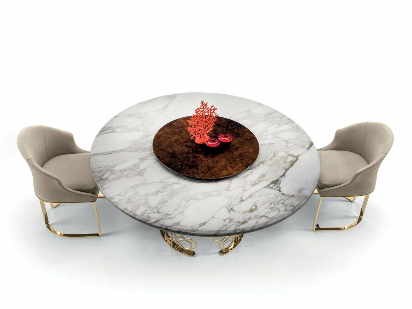 Стол может быть дополнен накладной поворотной поверхностью, что делает его функциональным и удобным для использования в различных сценариях — от уютных семейных ужинов до шикарных торжеств. Возможность выбора отделки для накладной поверхности, включая стекло и лакированное дерево, открывает перед вами безграничные горизонты для реализации дизайнерских идей.