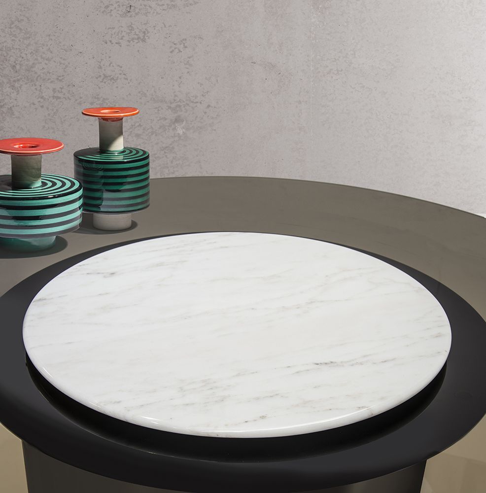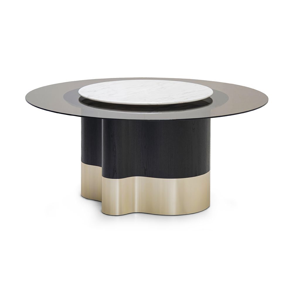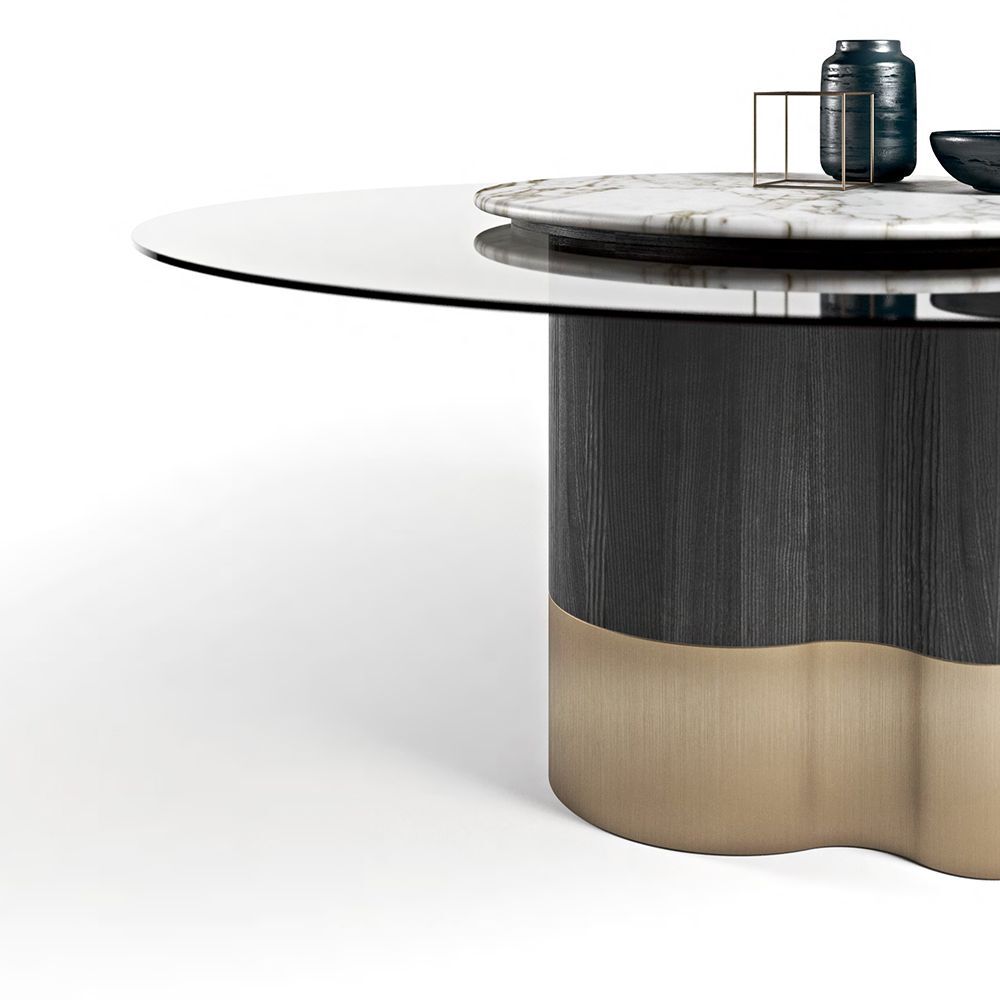 Обеденный стол MARYGOLD от итальянской фабрики FORMITALIA — воплощение роскоши и функциональности. Столешница из бронзового стекла сочетается с вращающейся вставкой «ленивая Сьюзен» из афьонского мрамора (диаметр 80 см). Основание выполнено из шпона ясеня с открытыми порами в благородном черном оттенке, дополненное деталями из мягкого металла белого золота.