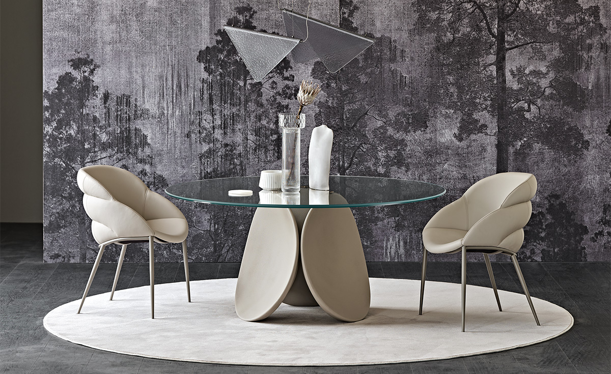 Стол MAXIM выполнен в современной эстетике, где каждая линия продумана до мелочей. Круглая столешница с плавными очертаниями создает ощущение легкости, а массивное основание придает композиции устойчивость и монументальность. Этот контраст делает модель универсальной – она одинаково органично впишется как в классический, так и в современный интерьер.