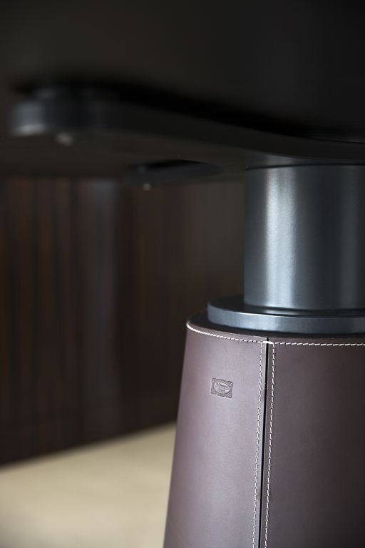 Каждая деталь выполнена из благородных материалов: мрамора, кожи Pelle Frau® и дерева. Столешница может быть оформлена шпоном из ясеня или обивкой из кожи, что придает ему роскошь и стиль.