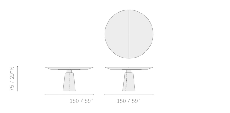 Доступен в нескольких размерах: круглые столы диаметром 120, 150 и 180 см, а также прямоугольный размером 260 x 110 см. Уникальный механизм Lazy Susan добавляет удобства при использовании.
